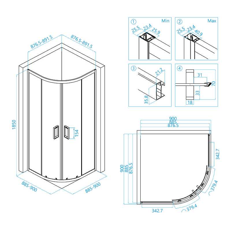 Размеры с диапазоном регулировок (ШхД): 885-900 х 885-900 мм.