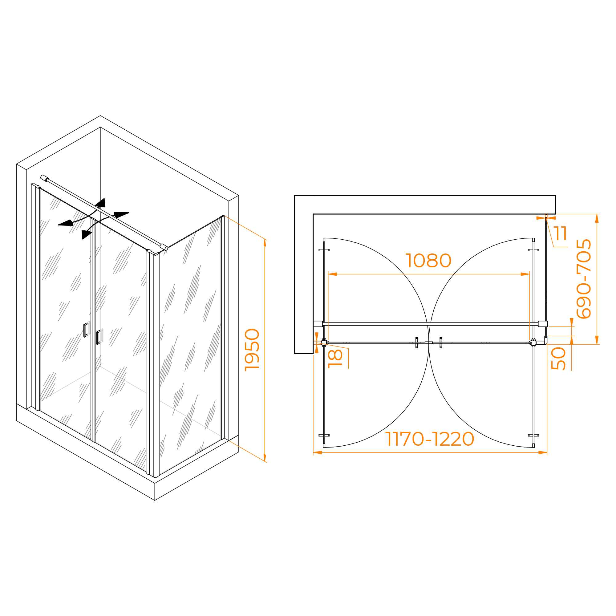 Высота душевого угла составляет 1950 мм, что делает его идеальным выбором для разных типов помещений. Независимо от высоты потолка, этот душевой угол легко вписывается в обстановку вашей ванной комнаты.