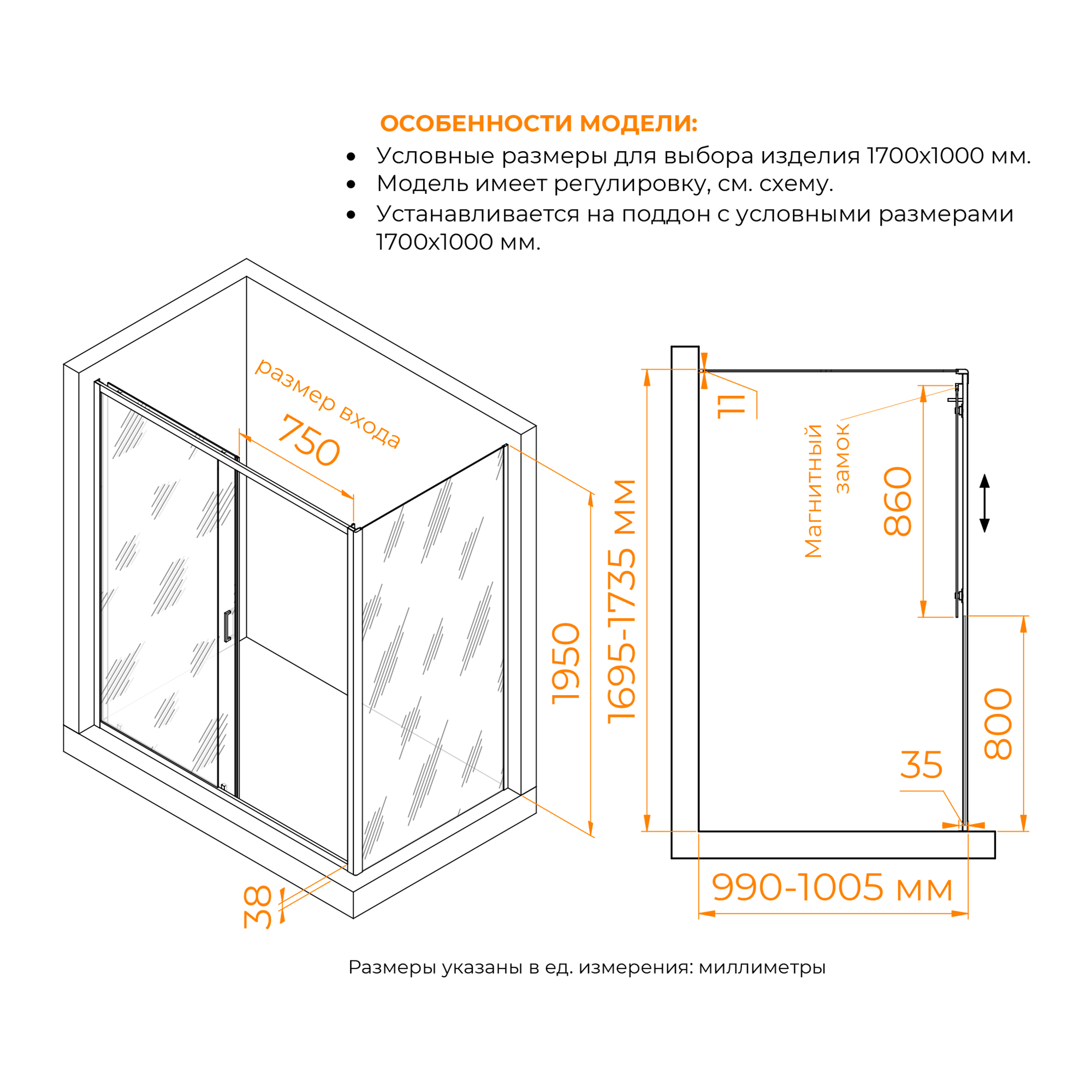 Высота душевого угла составляет 1950 мм, что позволяет легко входить и выходить из душа. Конструкция дверей раздвижная, что обеспечивает удобство использования и экономию пространства. Двойные регулируемые ролики обеспечивают плавное и бесшумное открытие и закрытие дверей.
