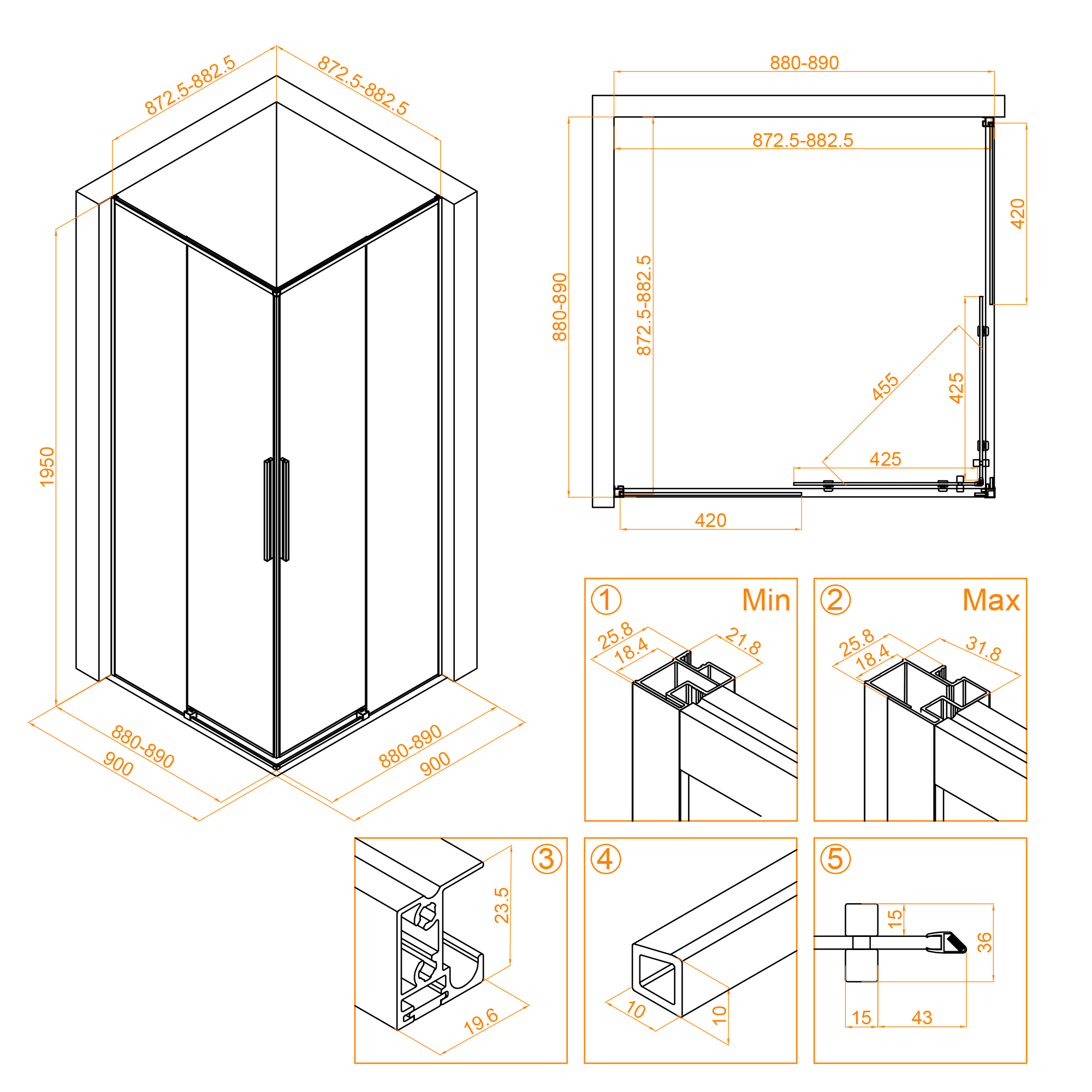 Душевой уголок имеет квадратную форму, что позволяет оптимально использовать пространство в вашей ванной комнате. Высота уголка составляет 1950 мм, что обеспечивает достаточное пространство для комфортного принятия душа.