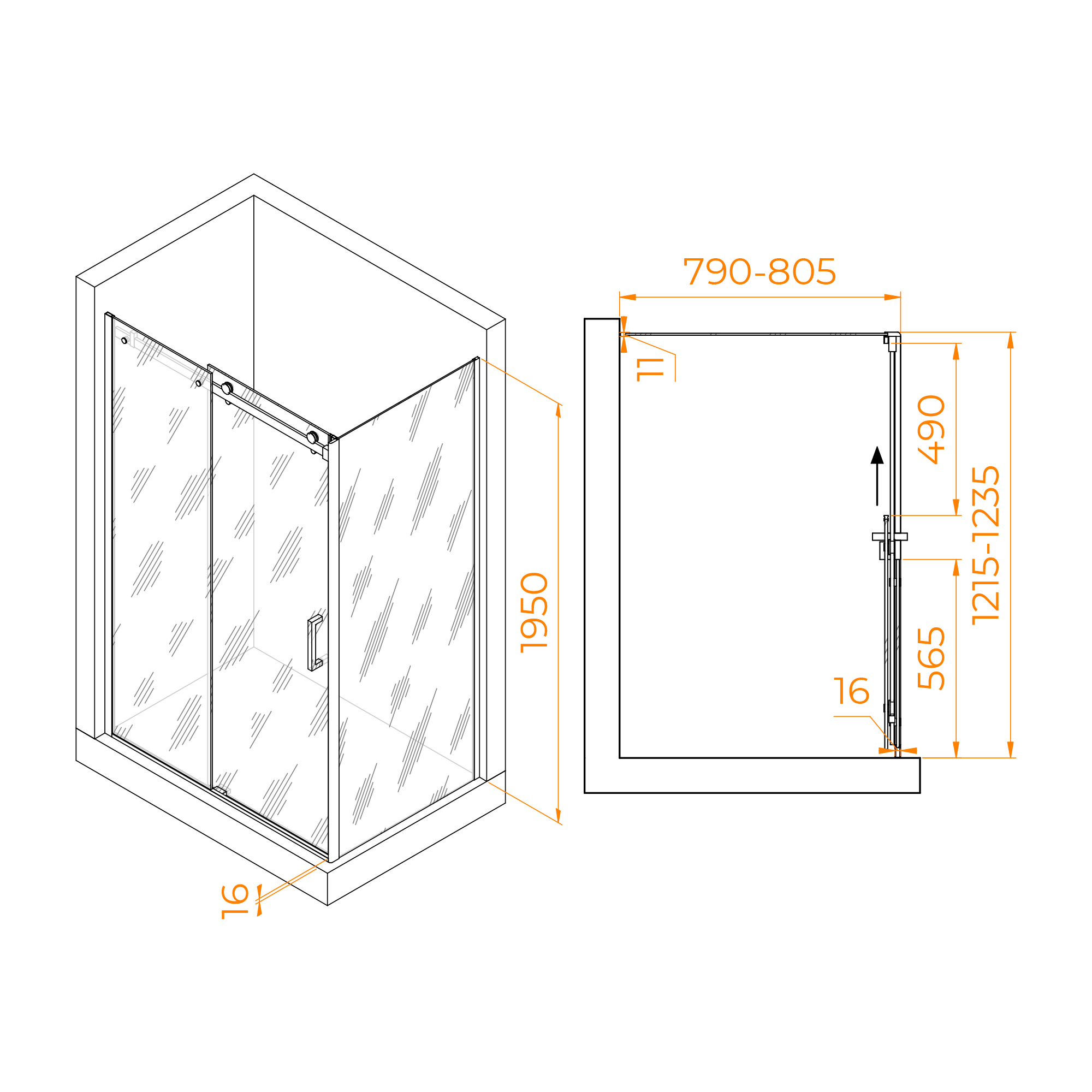 Высота душевого угла составляет 1950 мм, что обеспечивает удобство и комфорт во время использования. Регулируемый профиль позволяет адаптировать размеры уголка под особенности конкретной ванной комнаты, что делает его универсальным и функциональным решением.