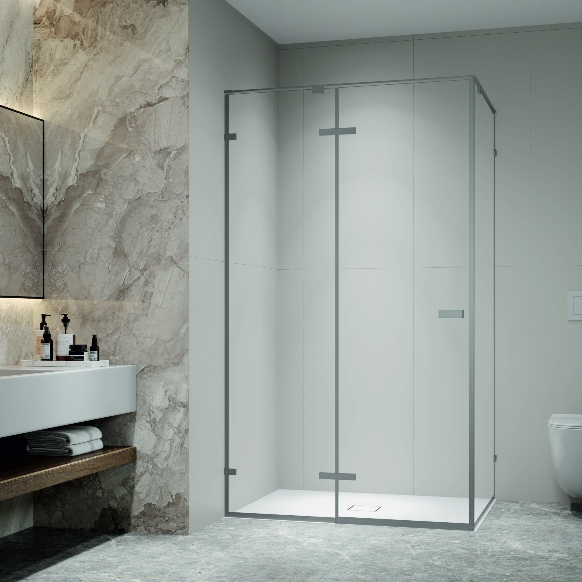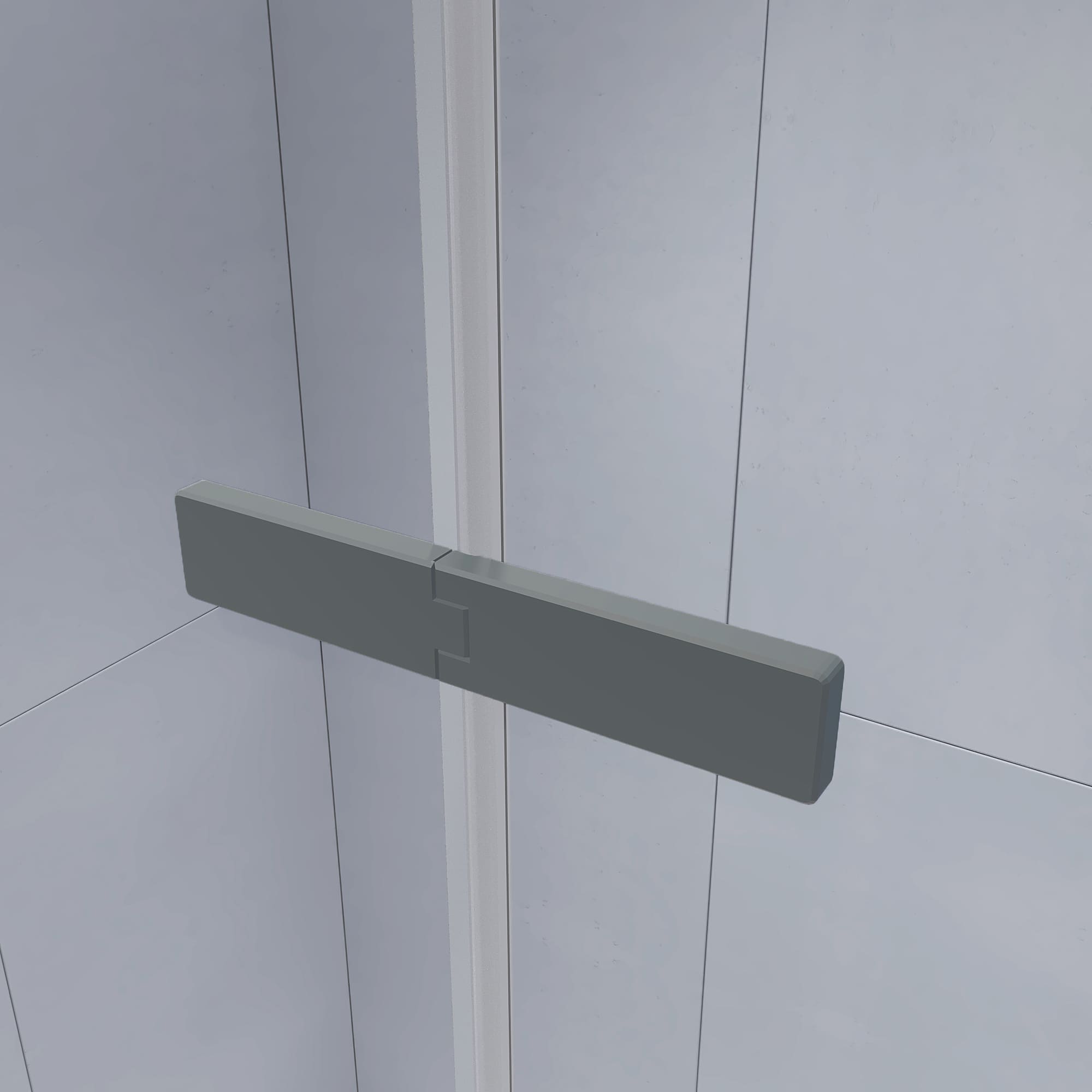Душевой уголок состоит из трех полотен стекла - два стационарных полотна и одно полотно «Дверь», которая распахивается на широкий вход, благодаря двум элегантным прямоугольным петлям, типа «стекло-стекло».