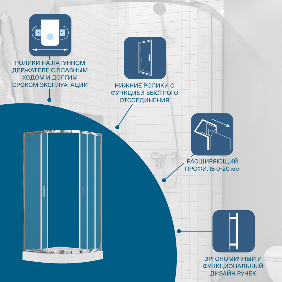 Душевое ограждение Вэлия - это высококачественное решение для Вашего душевого пространства по доступной цене! Безопасное закаленное стекло толщиной 6 мм придает дополнительную монтажную устойчивость конструкции. Алюминиевые профили не подвергаются коррозии благодаря образованию тончайшей оксидной пленки на поверхности, предохраняющей профили ограждения от дальнейших окислительных реакций с водой и воздухом. Качественные ролики на латунных держателях способны выдерживать тяжелые двери на протяжении всего периода службы изделия и также обладают высокой сопротивляемостью коррозии. Долговечные силиконовые уплотнители сохраняют эксплуатационные характеристики многие годы, не стираются и не высыхают – не становятся хрупкими. Дополнительно расширить пространство и нивелировать неровности стен позволяет компенсирующий профиль, создающий пространство для расширения до 20 мм. Быстросъемные нижние ролики делают уход за душевым ограждением более быстрым и простым, позволяя промывать нижнюю часть ограждения за счет дополнительного пространства, возникающего при отсоединении.