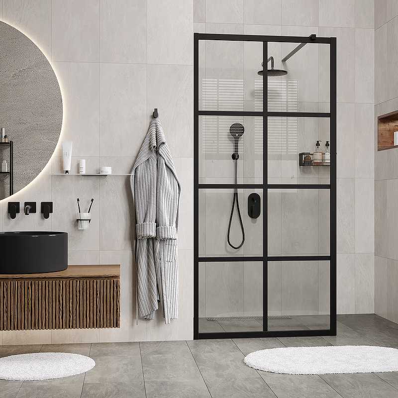 Закаленное прозрачное стекло 8 мм, с принтом. Нанесение методом шелкографии, Покрытие стекла WasserSchutz, Регулирующий профиль до 10 мм , Профиль по всему периметру стекла, Возможность правой и левой установки, Цвет профиля: черный, Фиксатор 1200 мм с возможностью обрезки, Покрытие профиля: порошковая краска