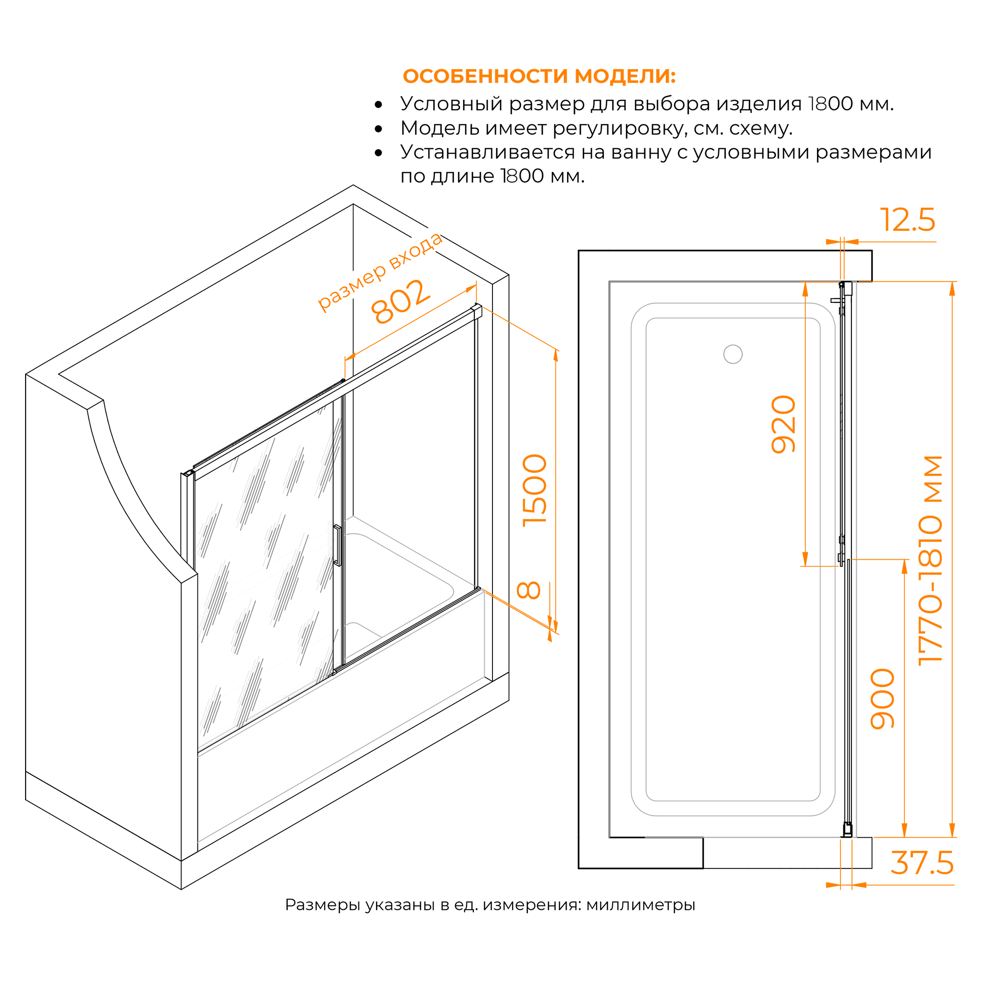 Душевые шторки для ванн RGW Screens 180x150 стекло прозрачное, профиль черный (34114518-14)