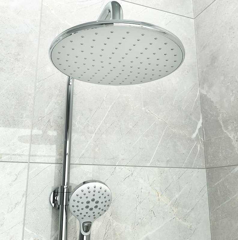 Верхняя лейка белая с хромом, 1 режим, диаметр 220 мм, шарнирное крепление.