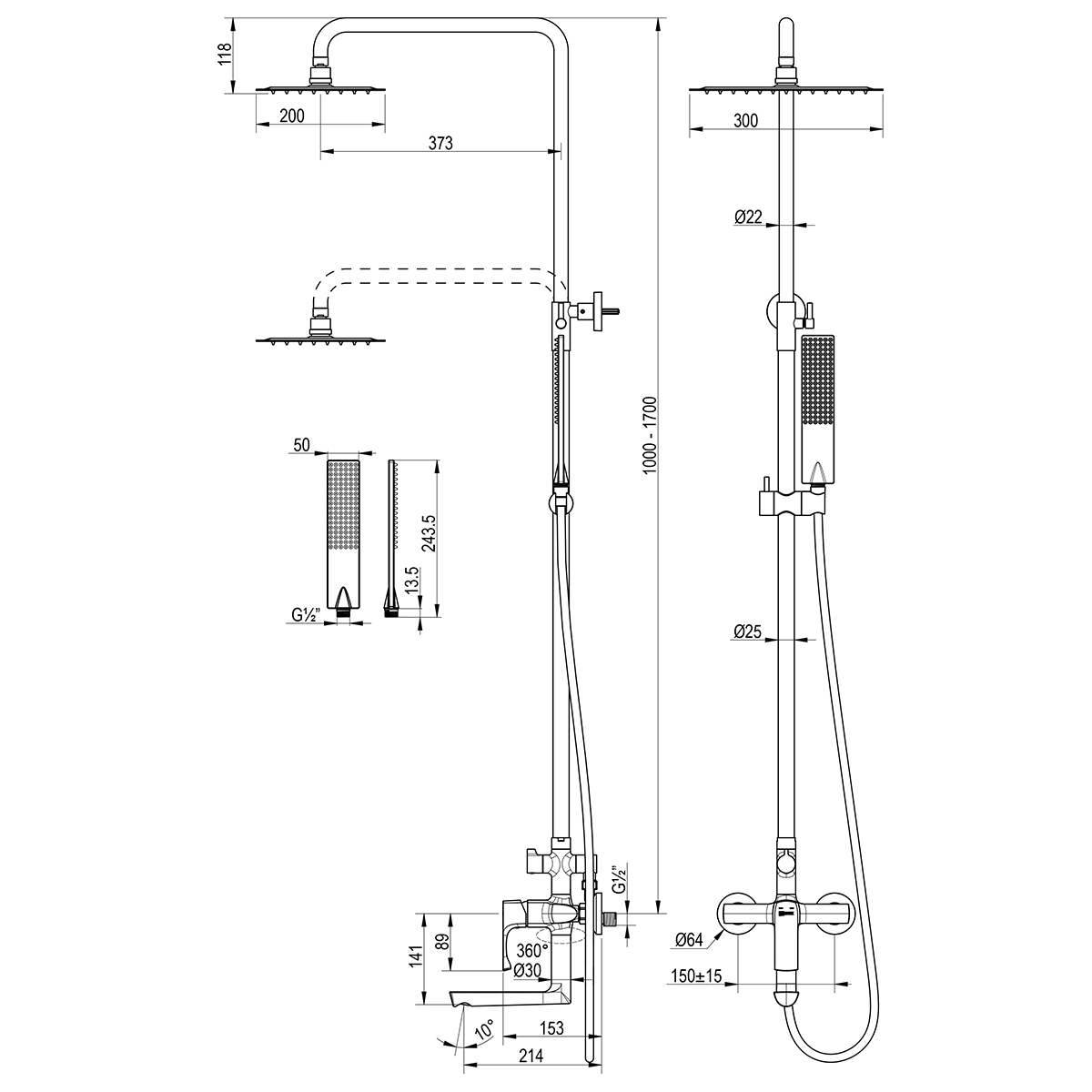 Душевая система с верхним душем 30х20 см и поворотным изливом, регулируемая высота 1~1,7м, латунь/брашированное светлое золото