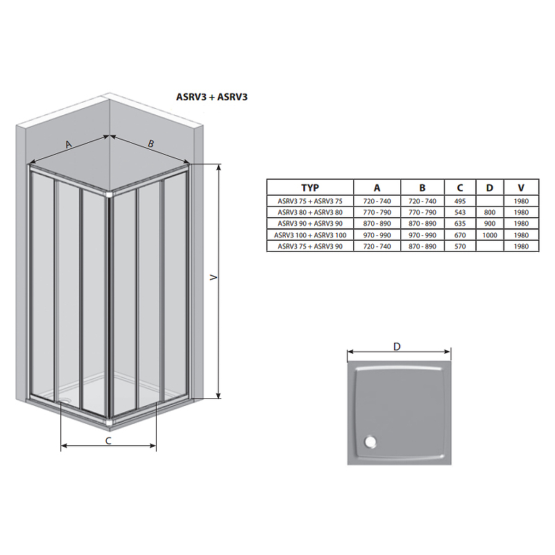 Для комплектации душевого уголка необходимо заказать 2 изделия ASRV3!