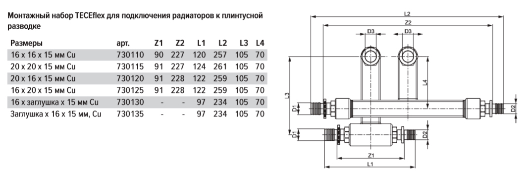 Для плинтусного подключения радиаторов. Включает разборные соединения 1/2" x 15 мм. Предназначен для монтажа с помощью угловых патрубков без вентилей для плинтусной разводки TECEflex или угловых патрубков с вентилями для плинтусной разводки TECEflex.
