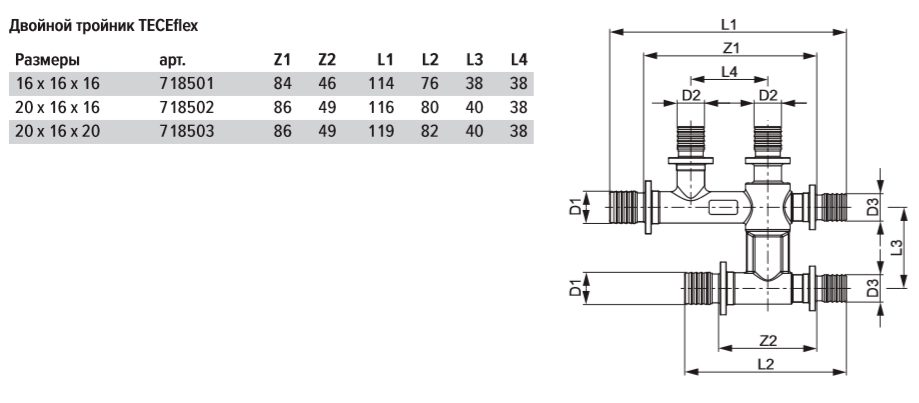 Двойной тройник TECEflex (никель) 20х16х16 мм. (718502)