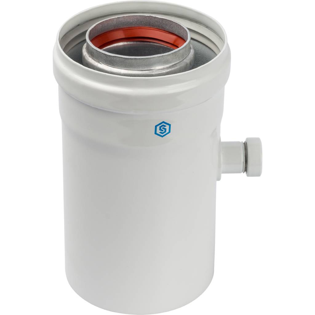 Данный элемент является горизонтальным конденсатосборником, который используется в жилых и коммерческих зданиях с целью предотвращения распространения вредных газов, образующихся в процессе сгорания внутри дымохода. Он снабжен входным и выходным отверстием диаметром 60 мм и 100 мм соответственно.