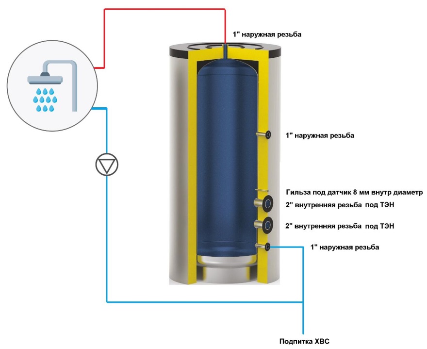 Бак S-Tank AT Electro применяется в системах с электрическими нагревательными элементами (ТЭНами). Устройство предназначенно для аккумулирования тепла от электротэнов, которые размещаются в отверстия диаметром 2". Стандартное количество отверстий – 2 шт. На внешней стороне бака расположены шпильки для крепления шкафа управления электрическими ТЭНами.
