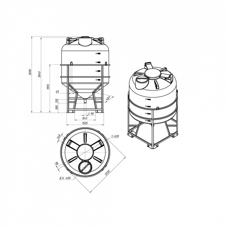При столь высоких характеристиках цена изделия ощутимо ниже, чем на металлические ёмкости аналогичной вместимости и конструкции. Для удобства эксплуатации конусная ёмкость на 5000 л в обрешётке оснащается патрубками диаметром 90, 110 или 160 мм, а также смещённой от оси резьбовой верхней крышкой с дыхательным клапаном. Заказать ёмкость ЦКТ 5000 в обрешётке на сайте можно в пару кликов в нескольких конфигурациях.