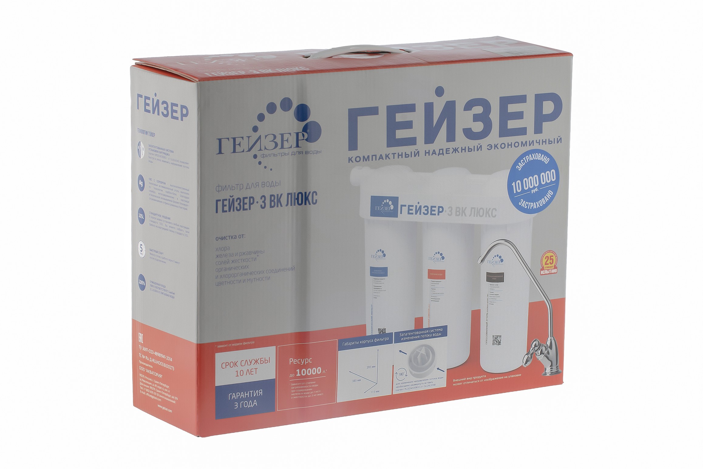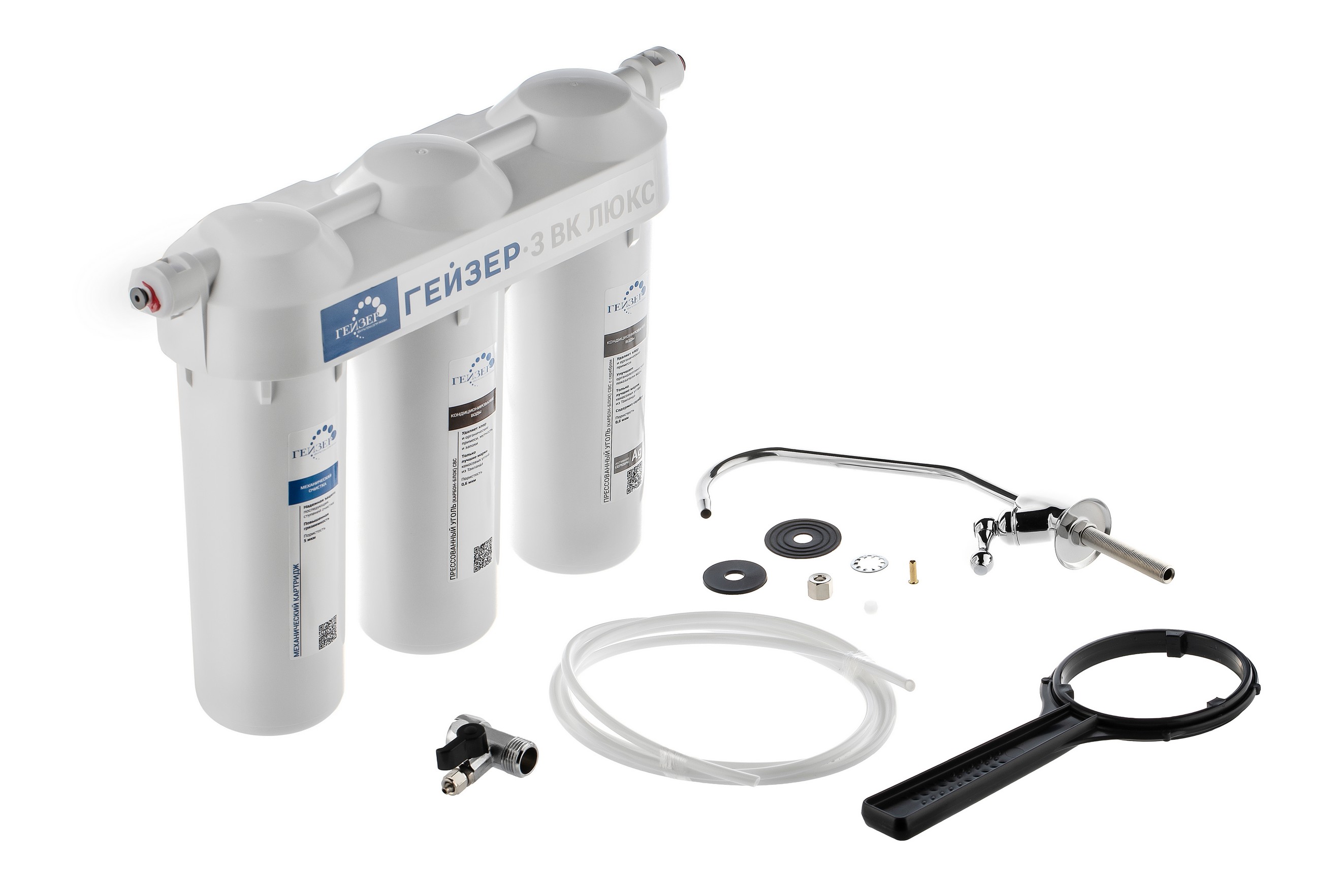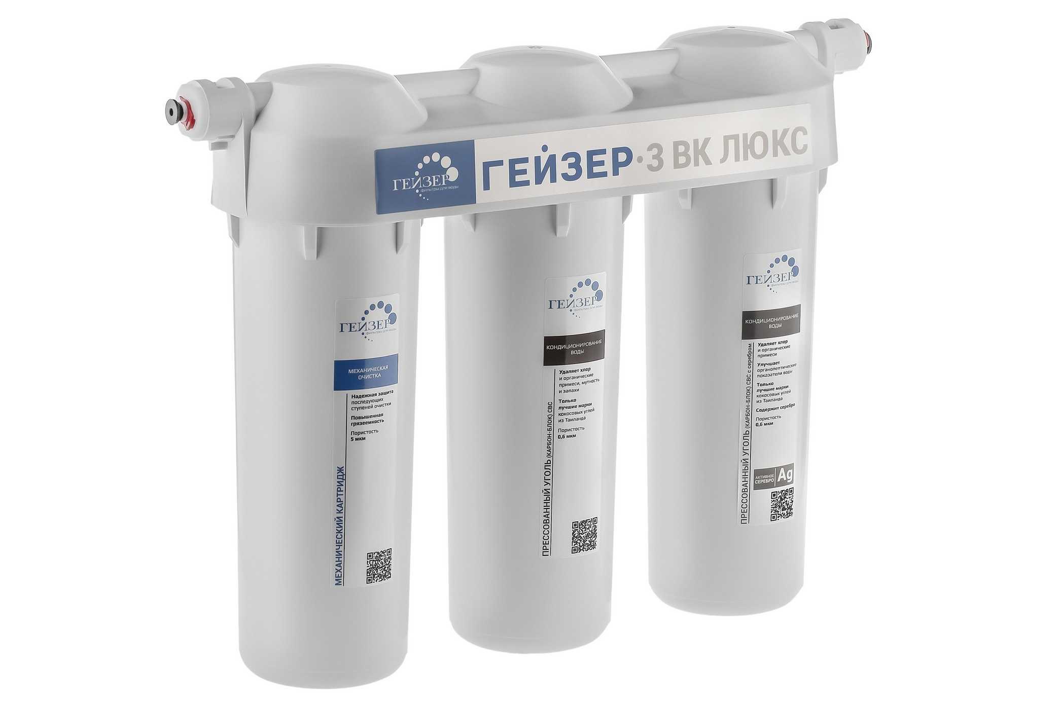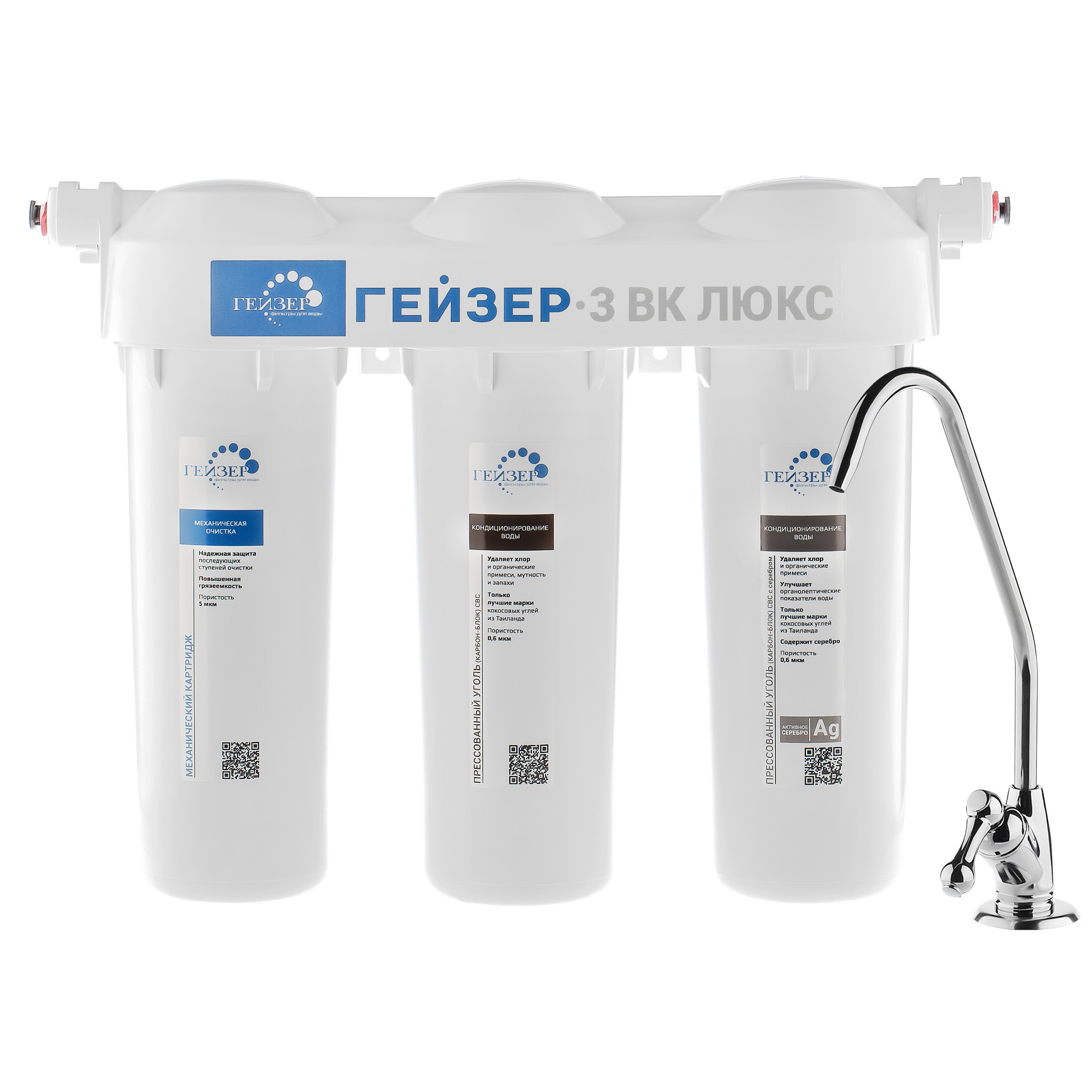 Трехступенчатый фильтр для мягкой воды Гейзер 3 ВК люкс 19048 - стационарное устройство для очистки мягкой водопроводной воды температурой до 40 градусов и доведения ее качества до питьевого.
