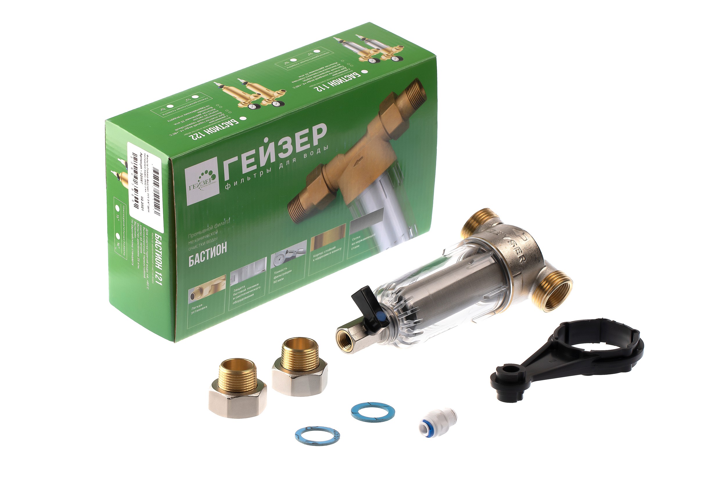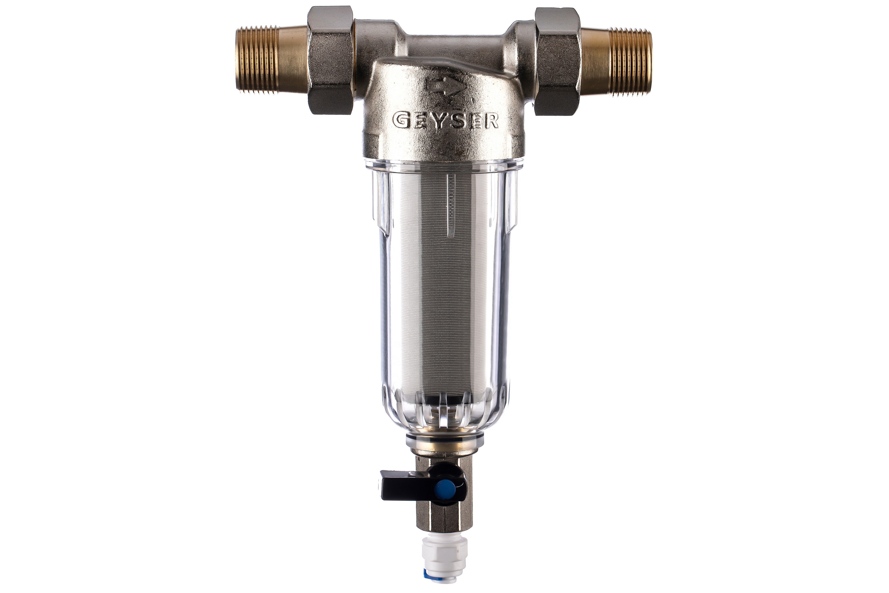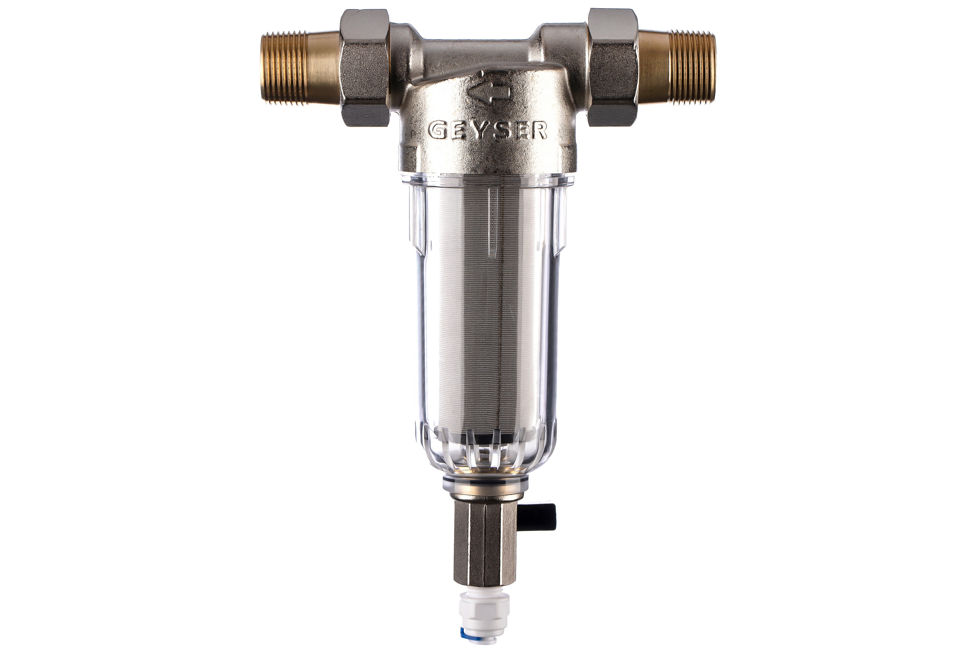 Фильтр самоочищающийся Гейзер-Бастион 111 3/4" (прозрачный корпус, со сгонами) (32667)
