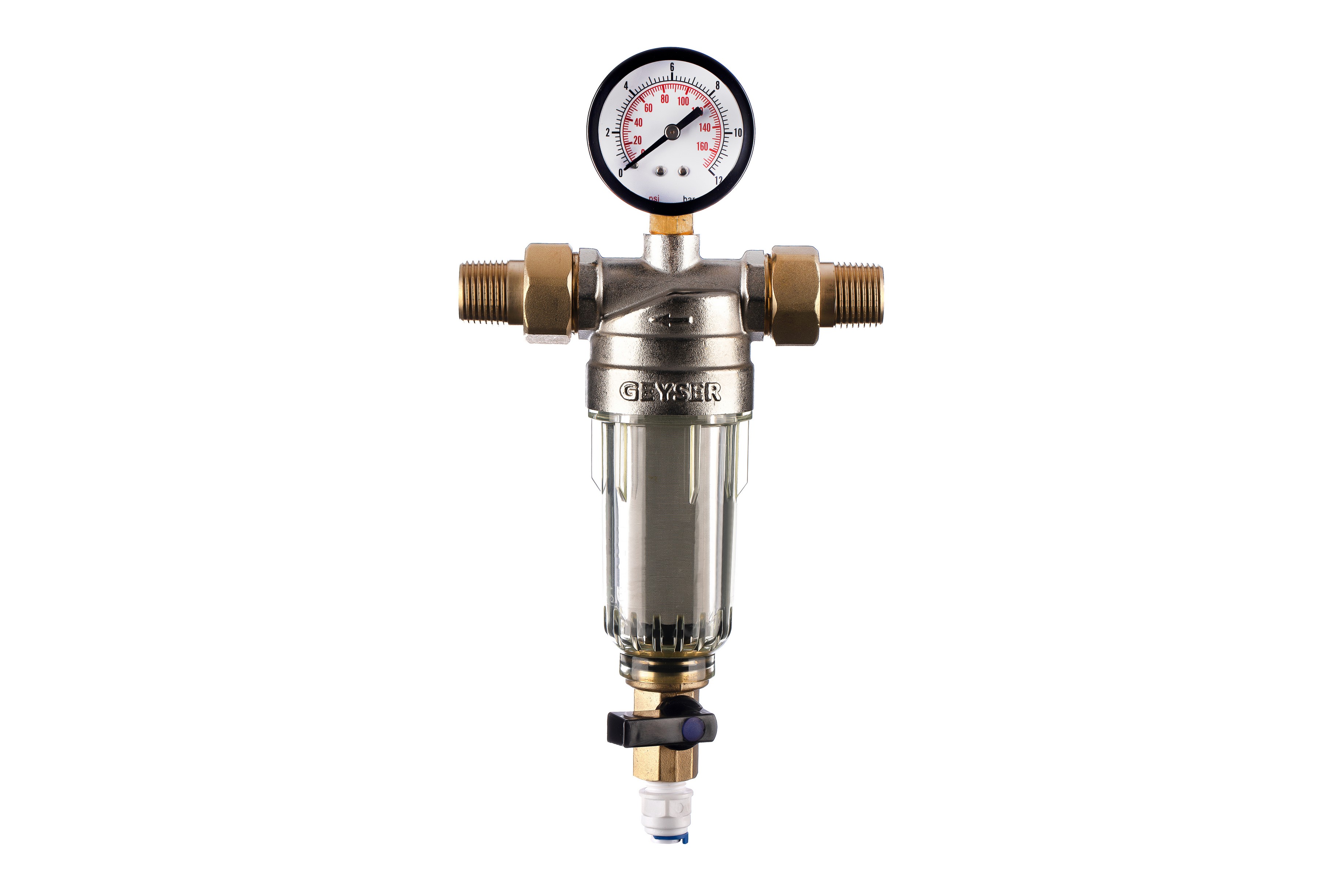 Фильтр с манометром самоочищающийся Гейзер-Бастион 7508165233 1/2" (прозрачный корпус, со сгонами) (32676)