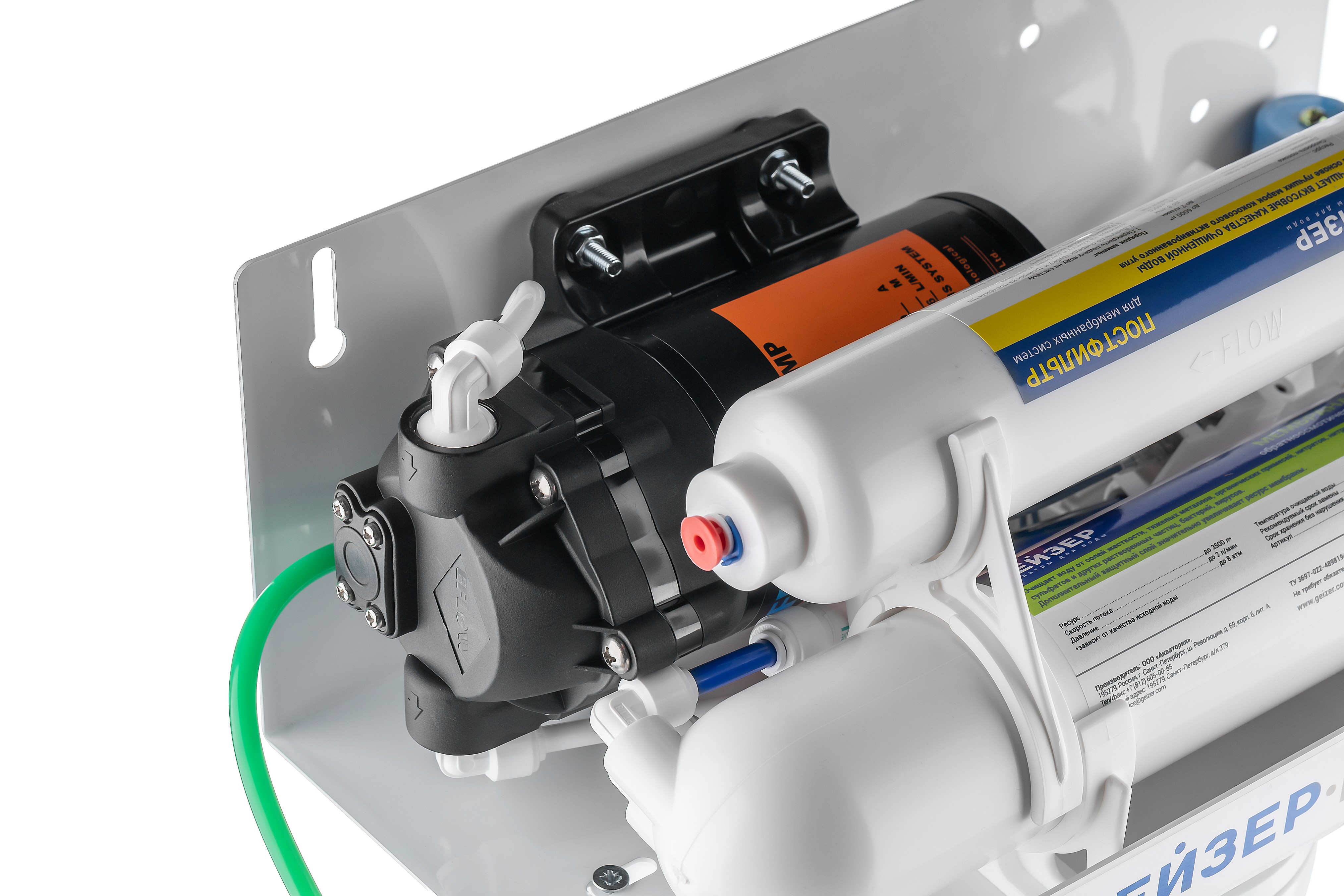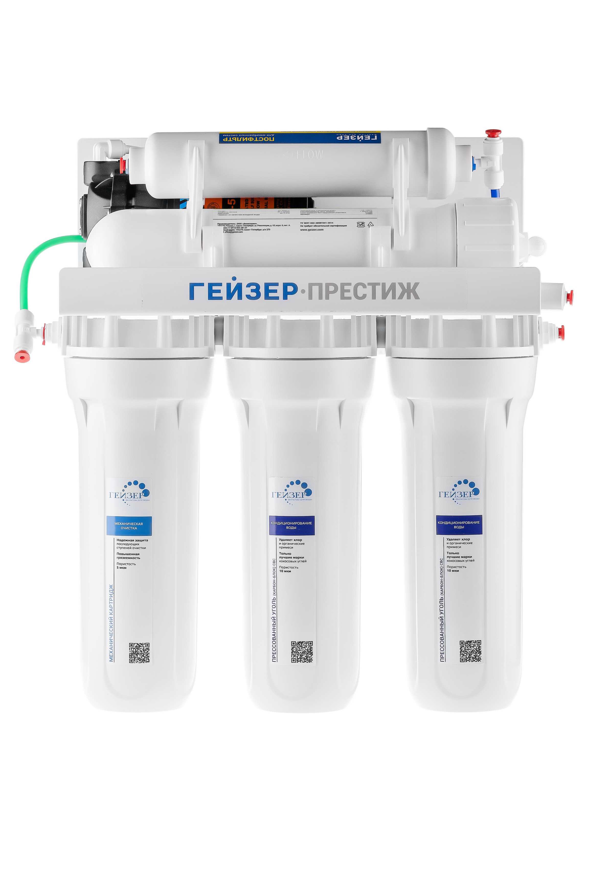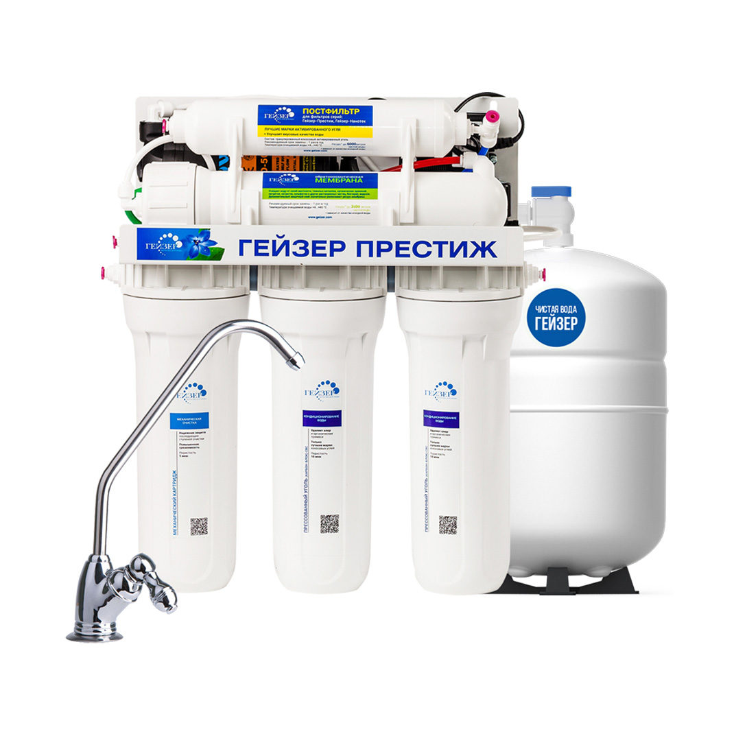 Технология обратного осмоса, использованная в фильтре Гейзер Престиж, заключается в фильтровании воды через полупроницаемую мембрану. Размеры пор мембраны настолько малы, что пропускают только молекулы воды. Размер молекул большинства примесей, а также бактерий и вирусов значительно больше молекул воды, поэтому они не проходят через мембрану. Фильтр Гейзер Престиж П работает при давлении в подводящей магистрали не менее 2 атм. Устройство повышения давления, входящее в комплект, повысит уровень давления до 3-6 атм.