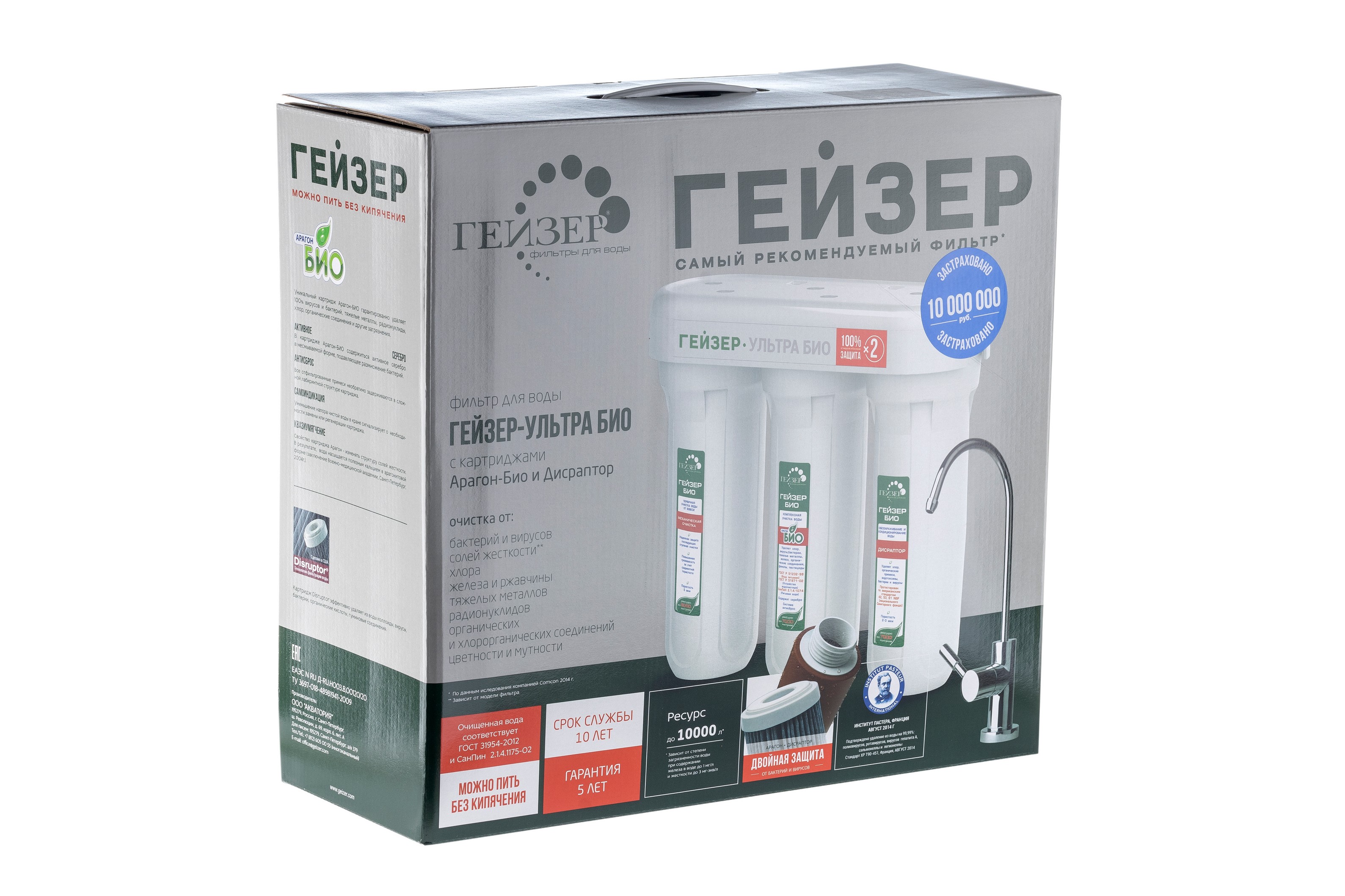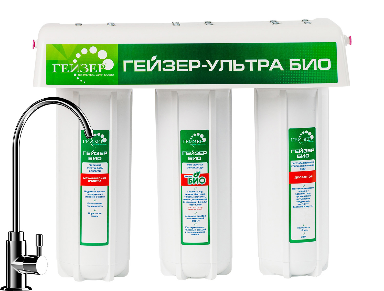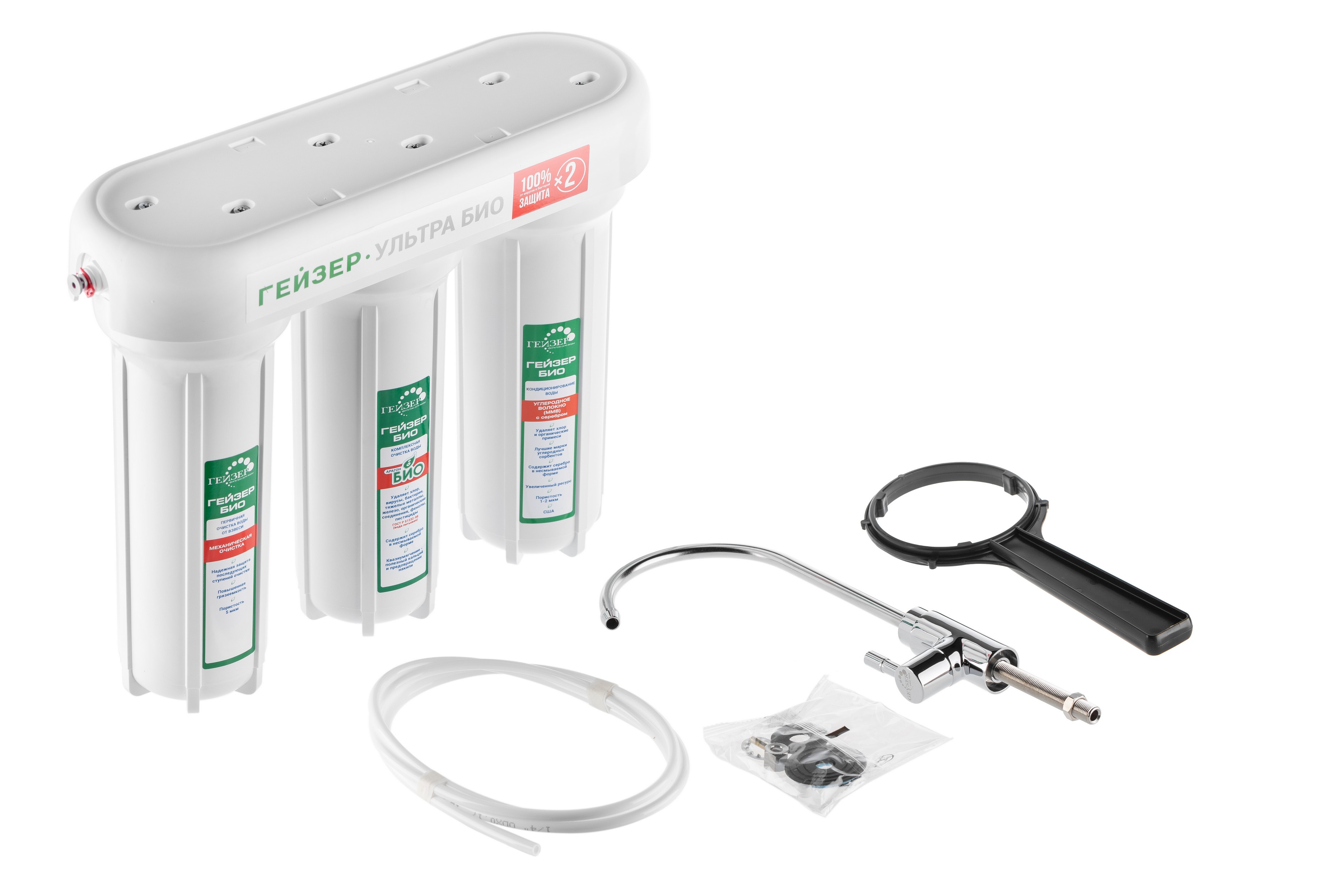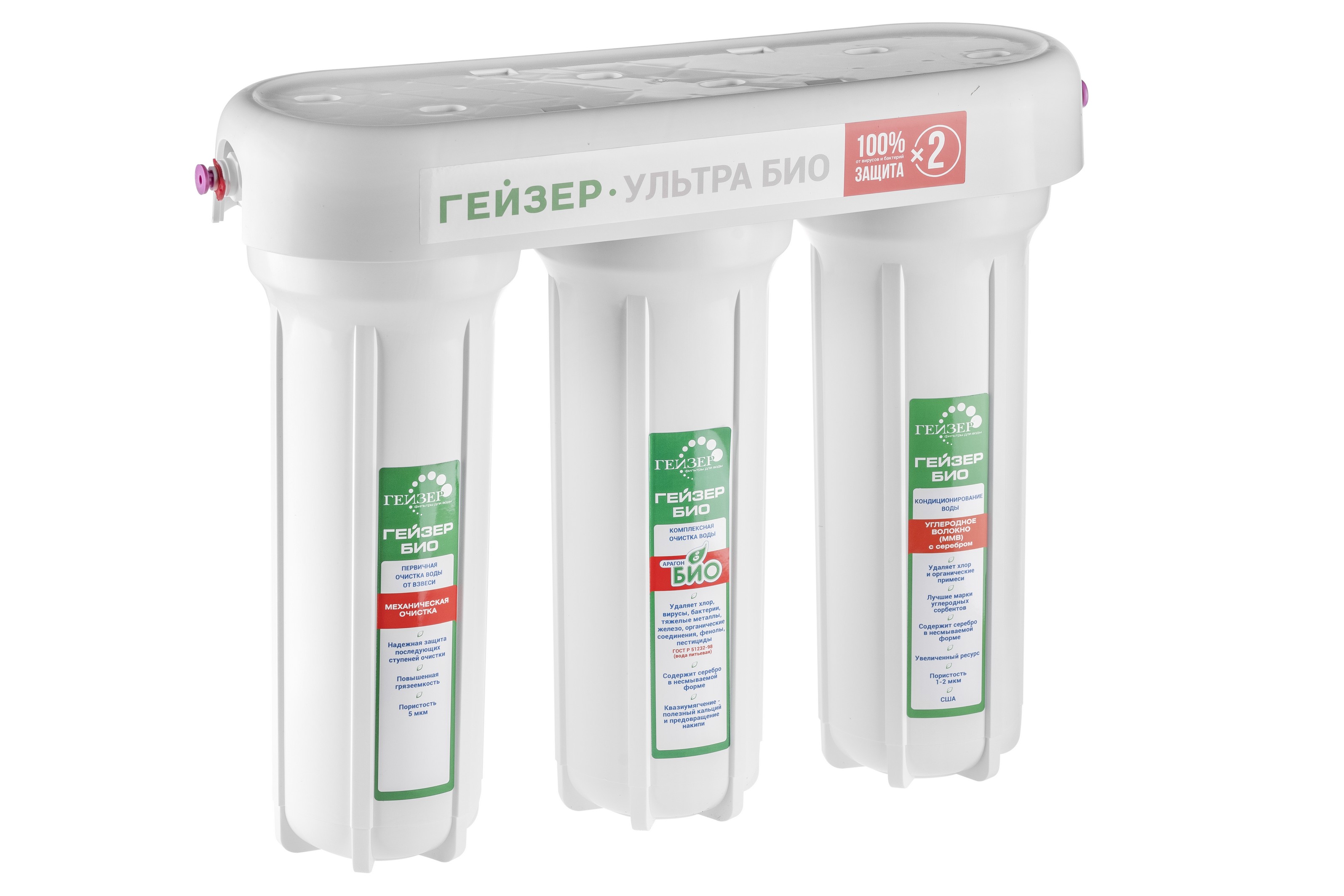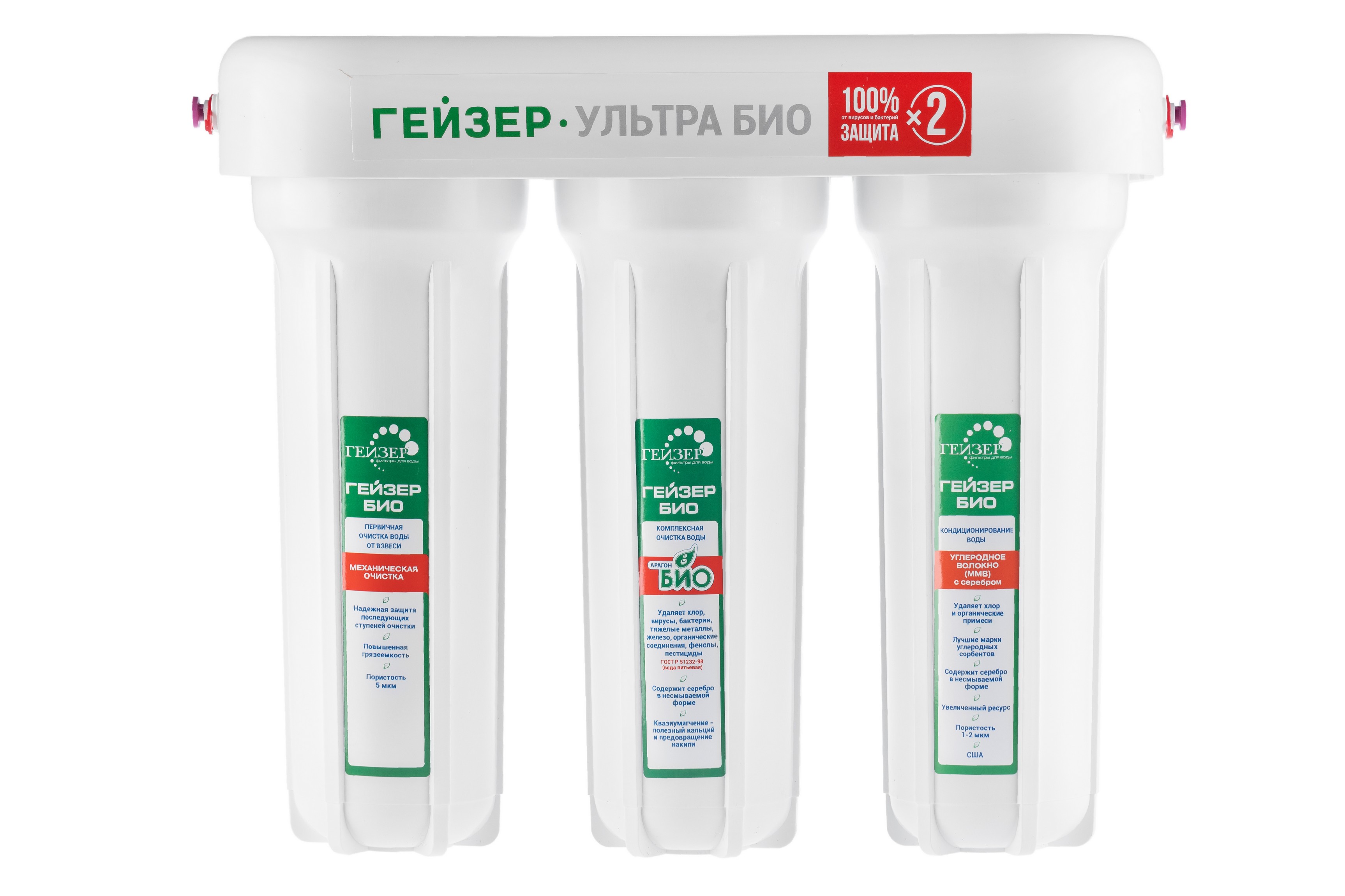 В фильтрах серии Гейзер Ультра БИО применена инновационная технология очистки воды. Сочетание картриджей Арагон–М БИО и Fiber Pro обеспечивают максимально возможное качество фильтрации, увеличенный ресурс, двойной ресурс по удалению бактерий и вирусов, а также прекрасный вкус чистой воды. Отсутствуют вредные выбросы для людей и окружающей среды. Корпус фильтра выполнен из пищевого пластика и выдерживает давление, превышающее рабочее в пять раз.