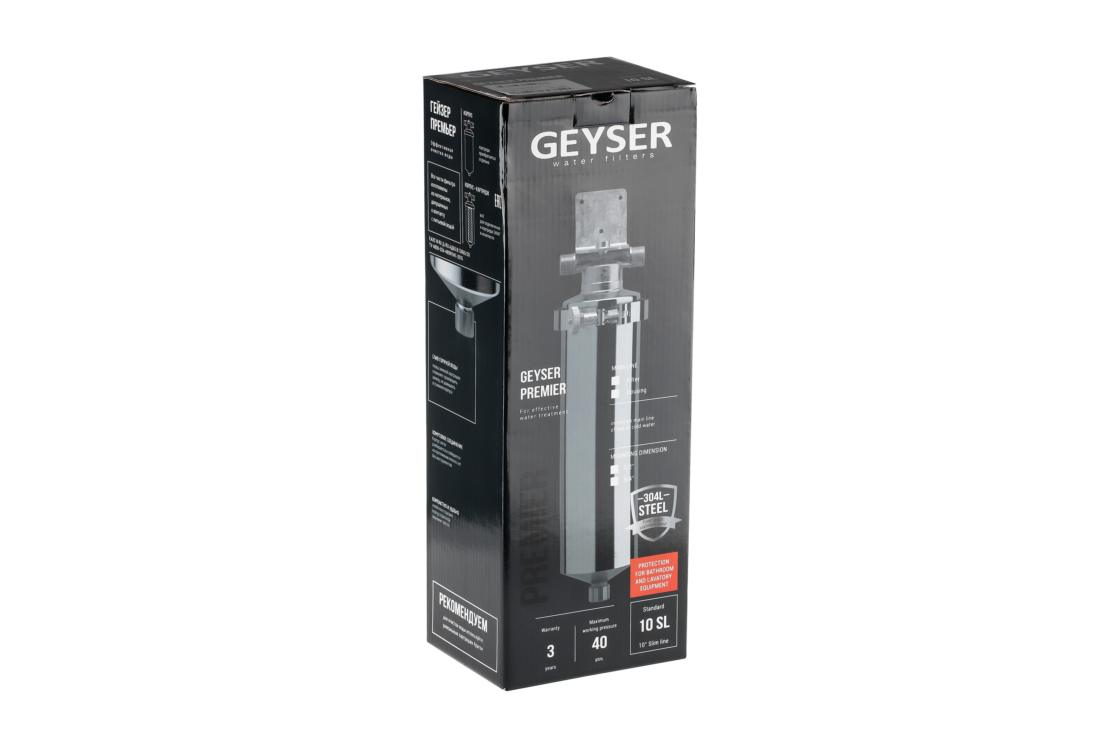 Гейзер-Премьер 10SL 3/4" устанавливается на вход в систему горячего или холодного водоснабжения. Корпус фильтра изготовлен из высококачественной нержавеющей стали марки 304L, устойчивой к возникновению коррозии, что гарантирует высокую надежность и многолетнюю работу фильтра.