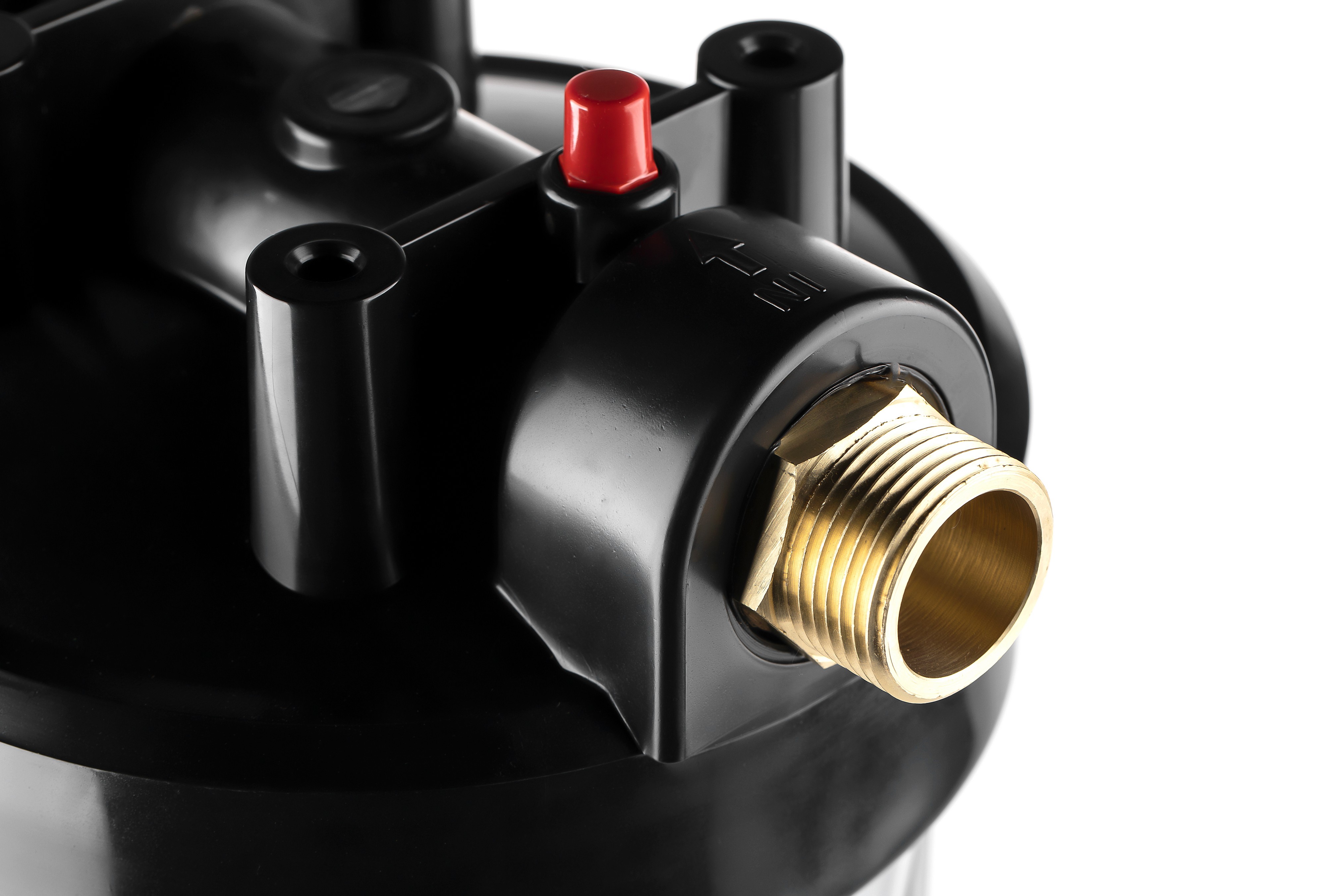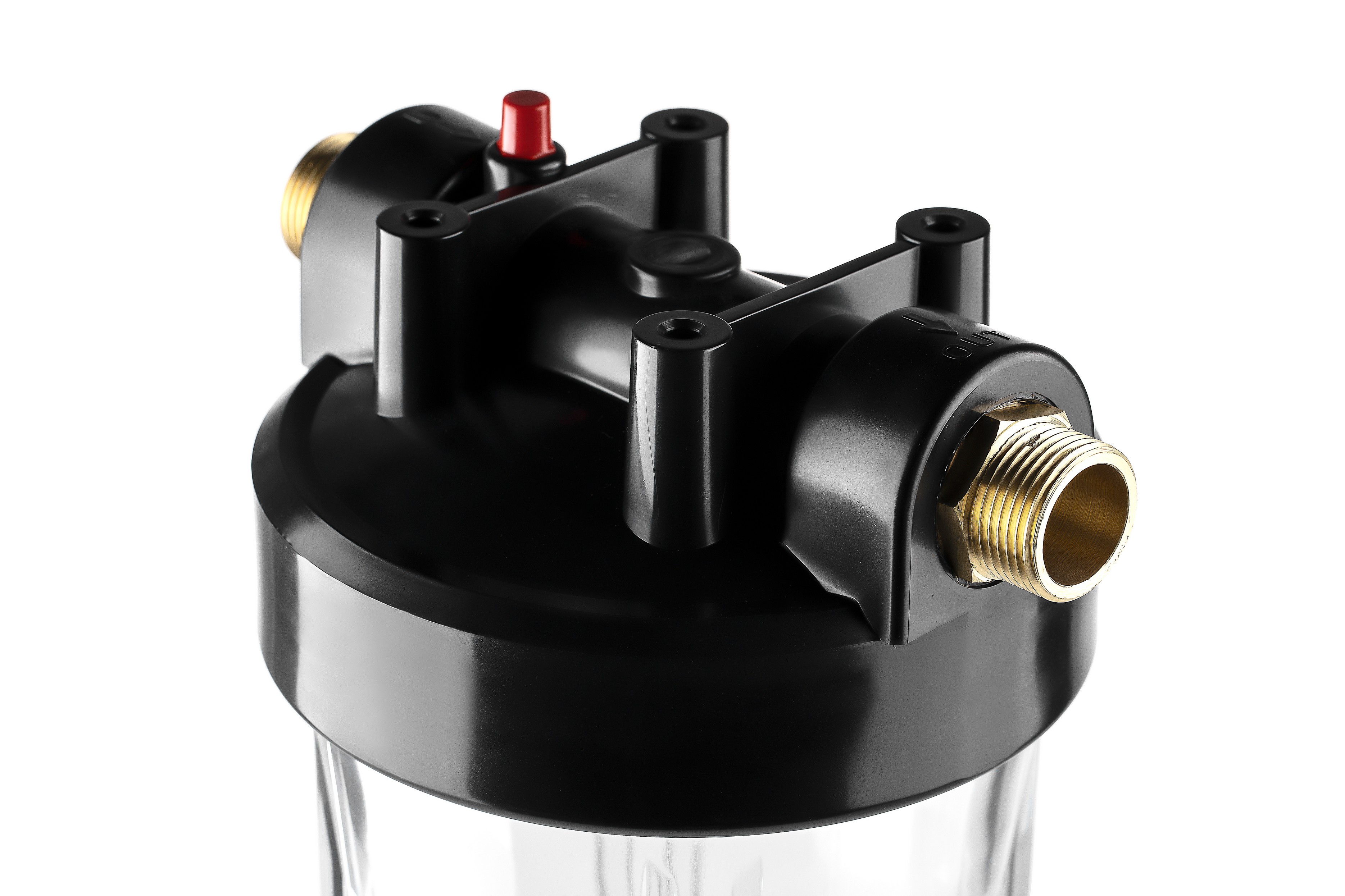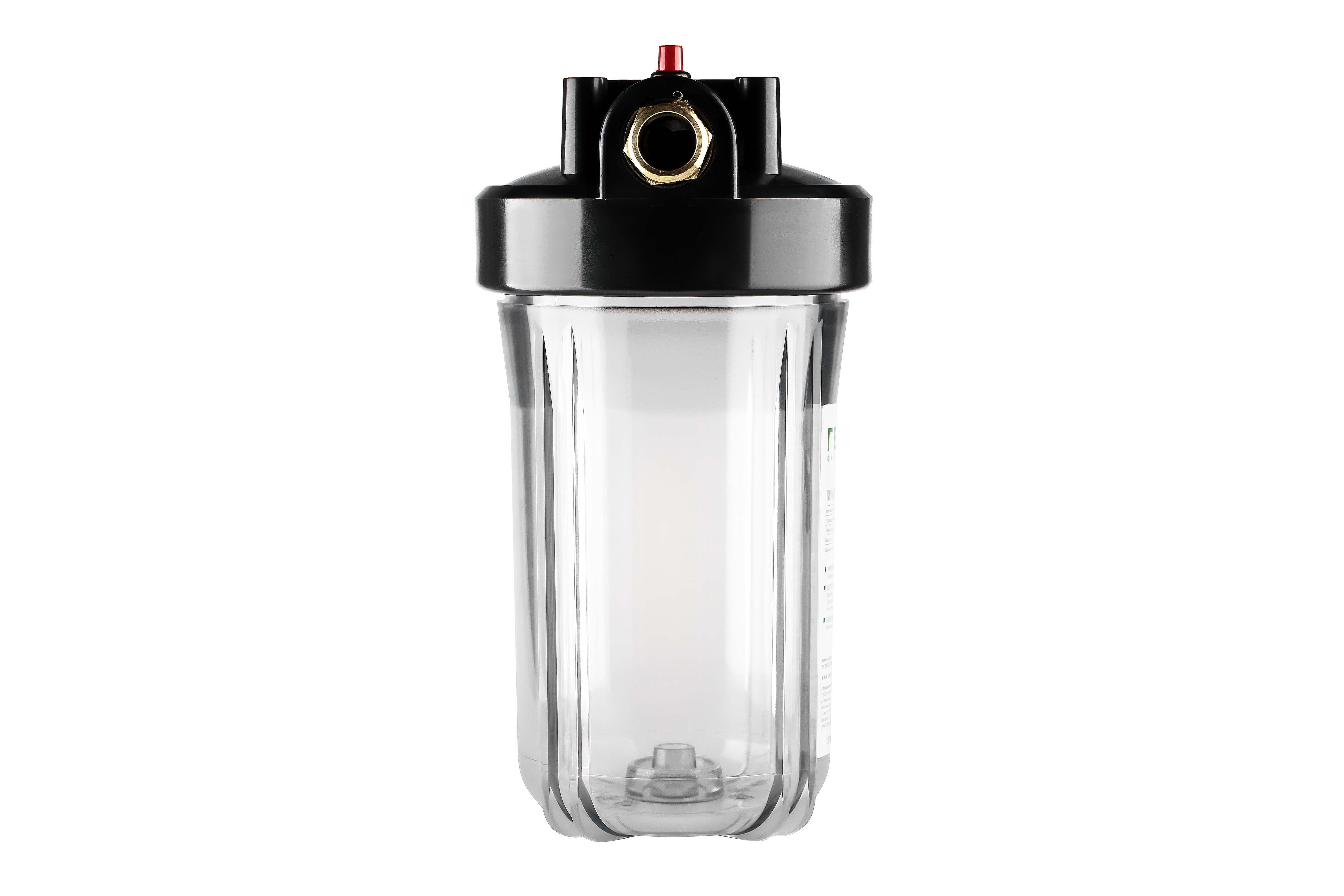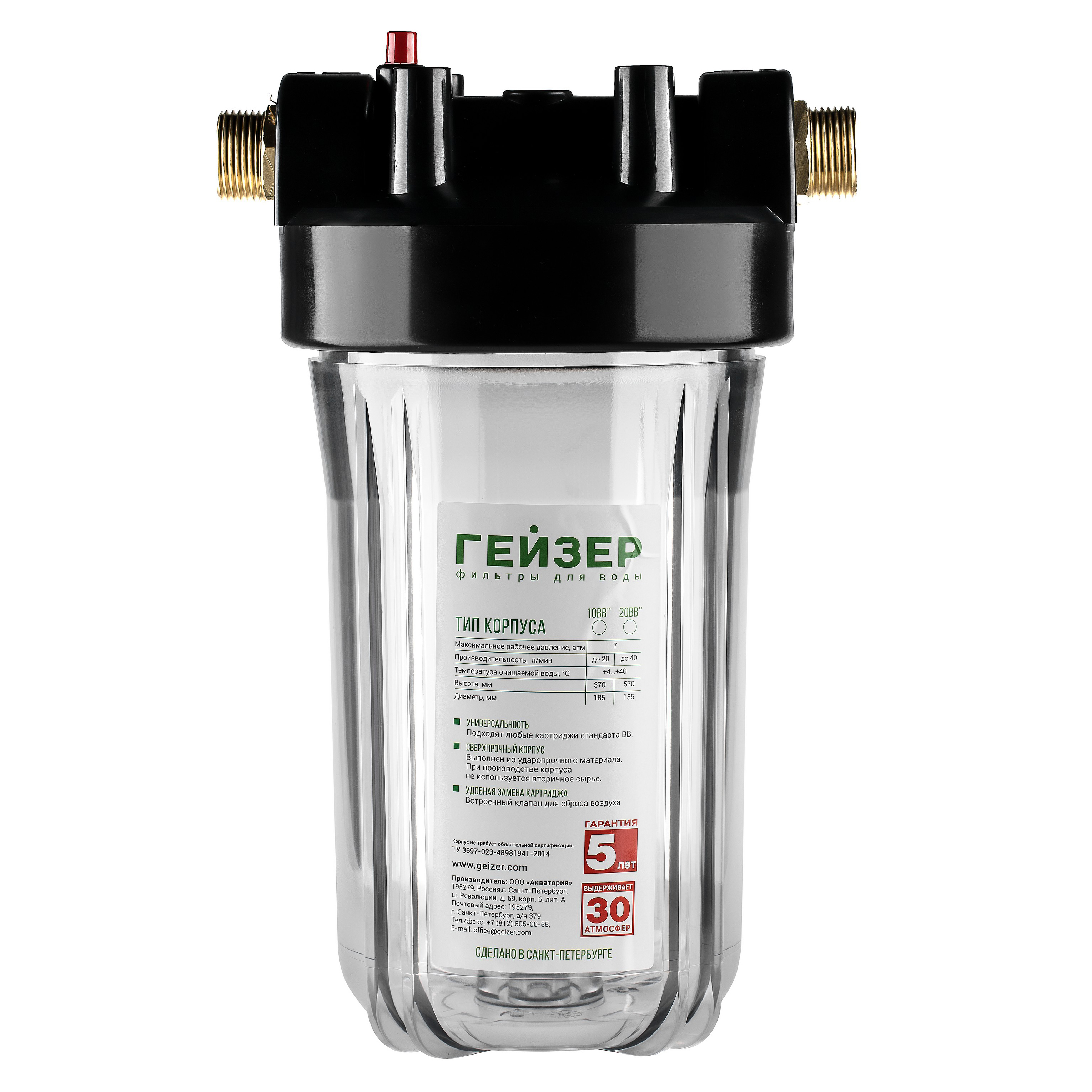 Корпус Гейзер 10BB прозрачный изготовлен из прозрачного полипропилена; крышка корпуса – черный полипропилен в комплекте с латунными ниппелями. Корпус рассчитан на работу под давлением и установку на входе в систему холодного водоснабжения. В производстве корпусов используется только первичное сырье пищевого класса.