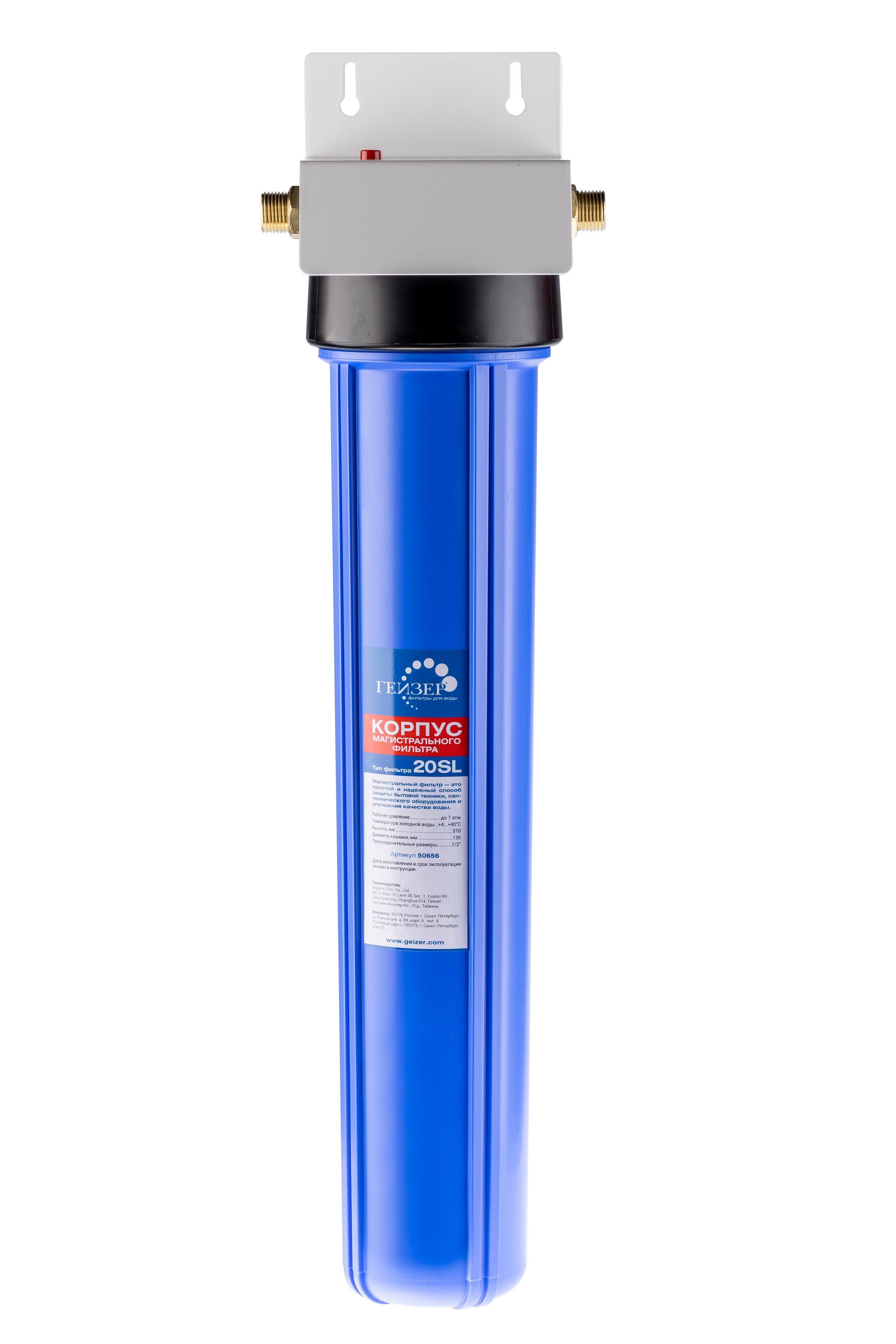 Корпус Double-Oring 20; SL, 1/2; изготовлен из прочного полипропилена с латунными ниппелями. Корпус рассчитан на работу под давлением и установку на входе в систему холодного водоснабжения. В производстве корпусов используются материалы пищевого класса.