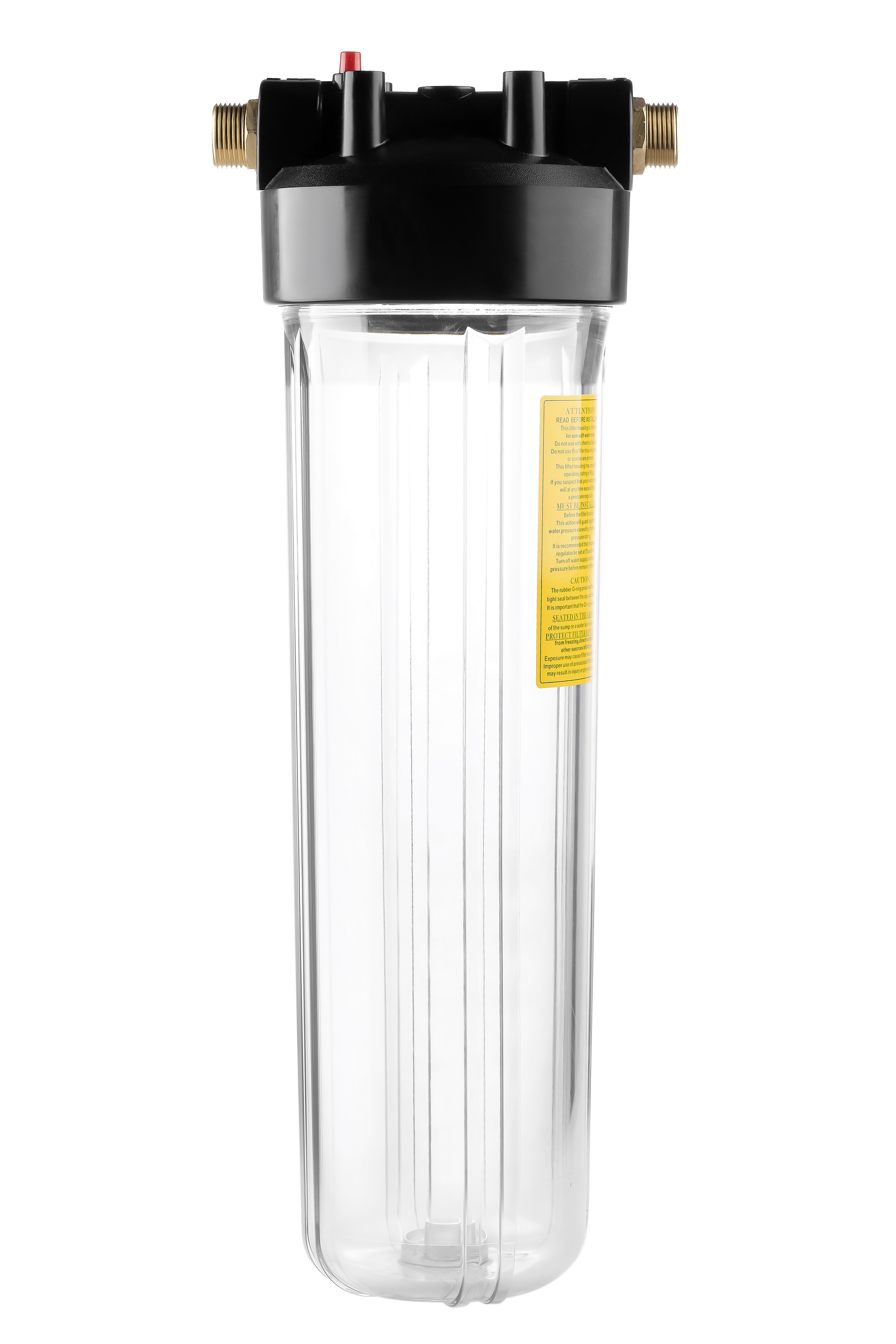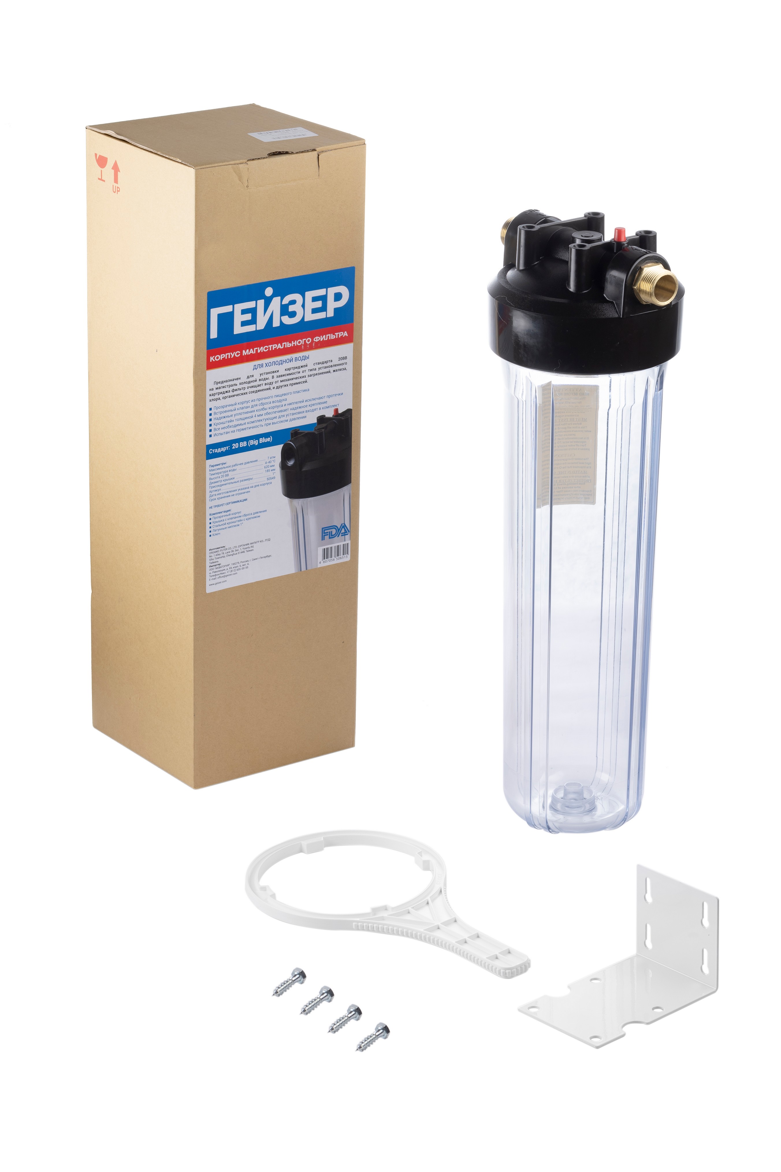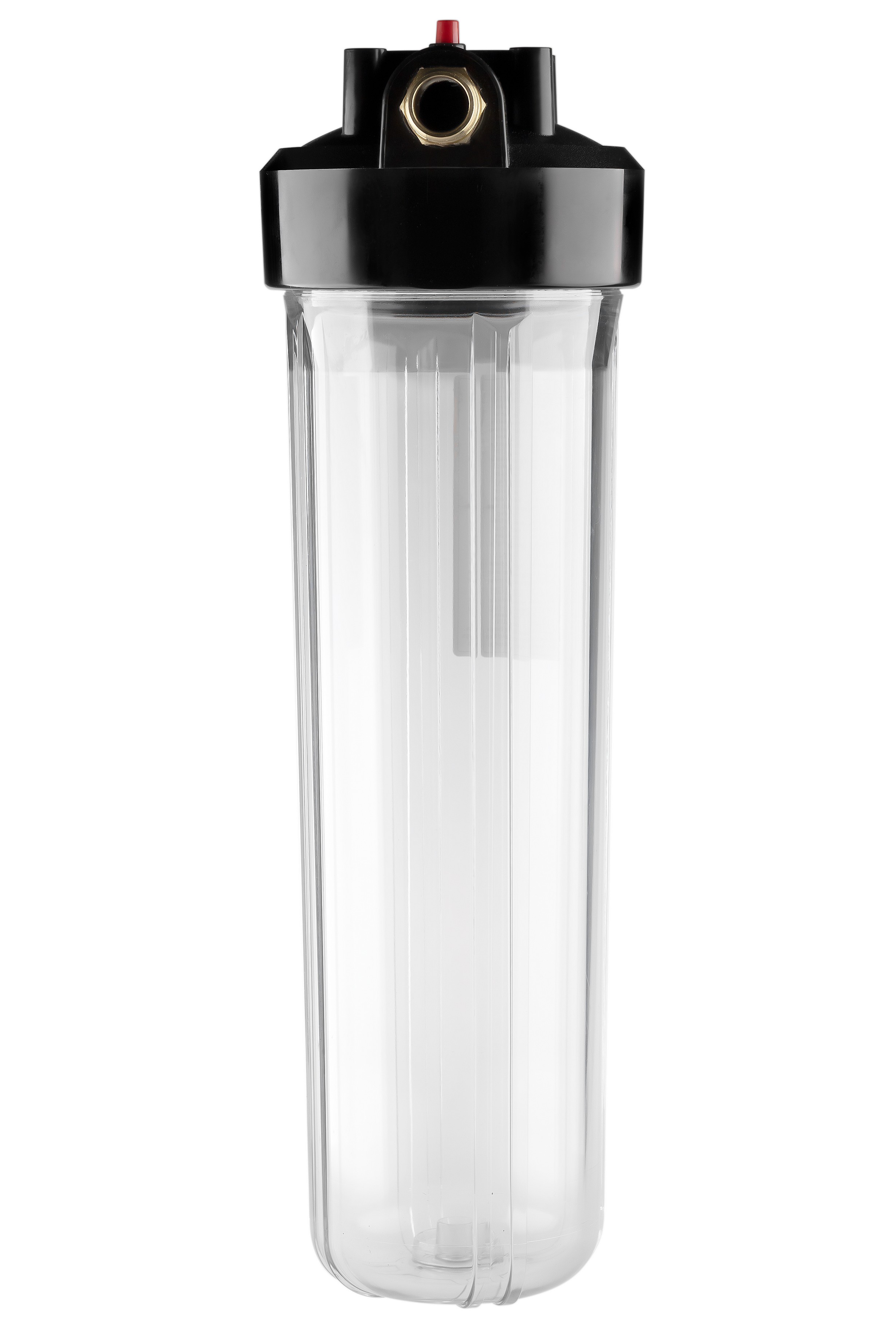 Корпус 20BB изготовлен из прозрачного пластика; крышка корпуса – из полипропилена. Корпус рассчитан на работу под давлением и установку на входе в систему холодного водоснабжения. В производстве корпусов используется только первичное сырье пищевого класса.