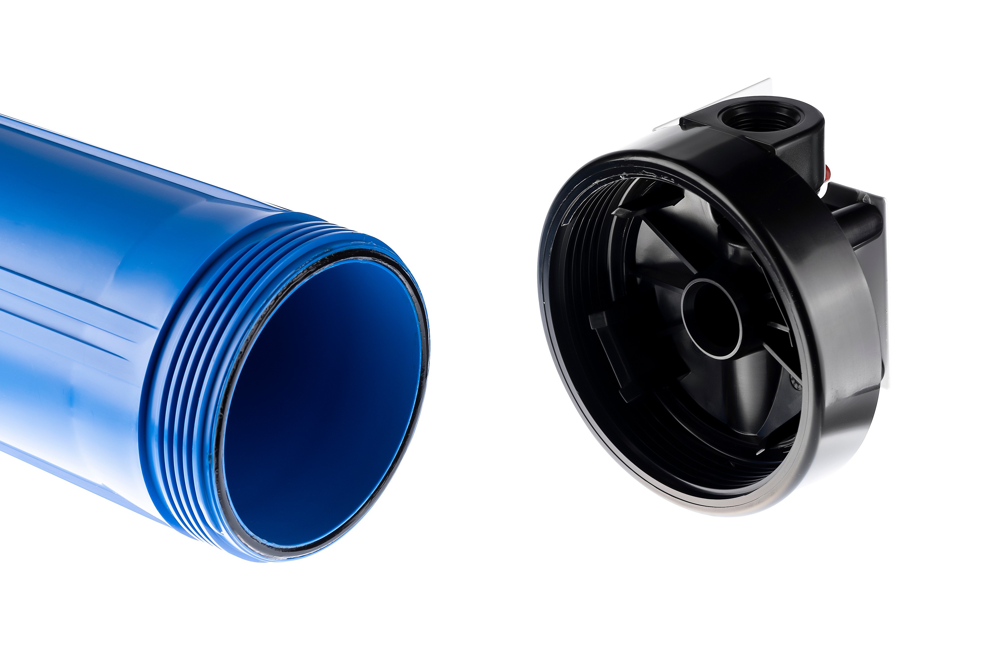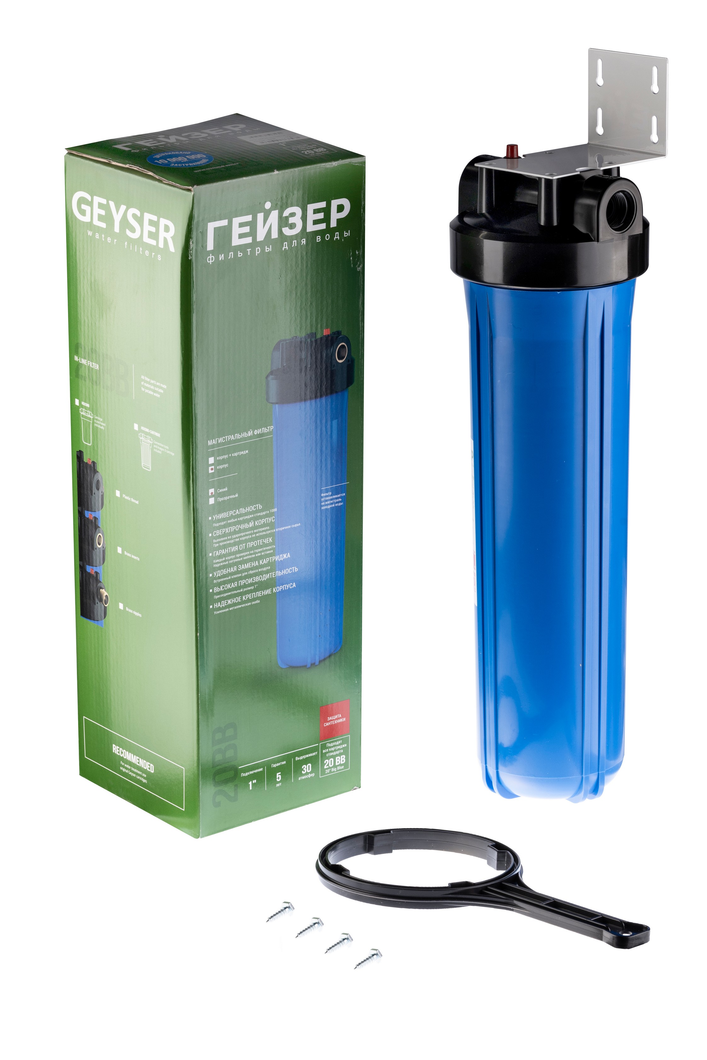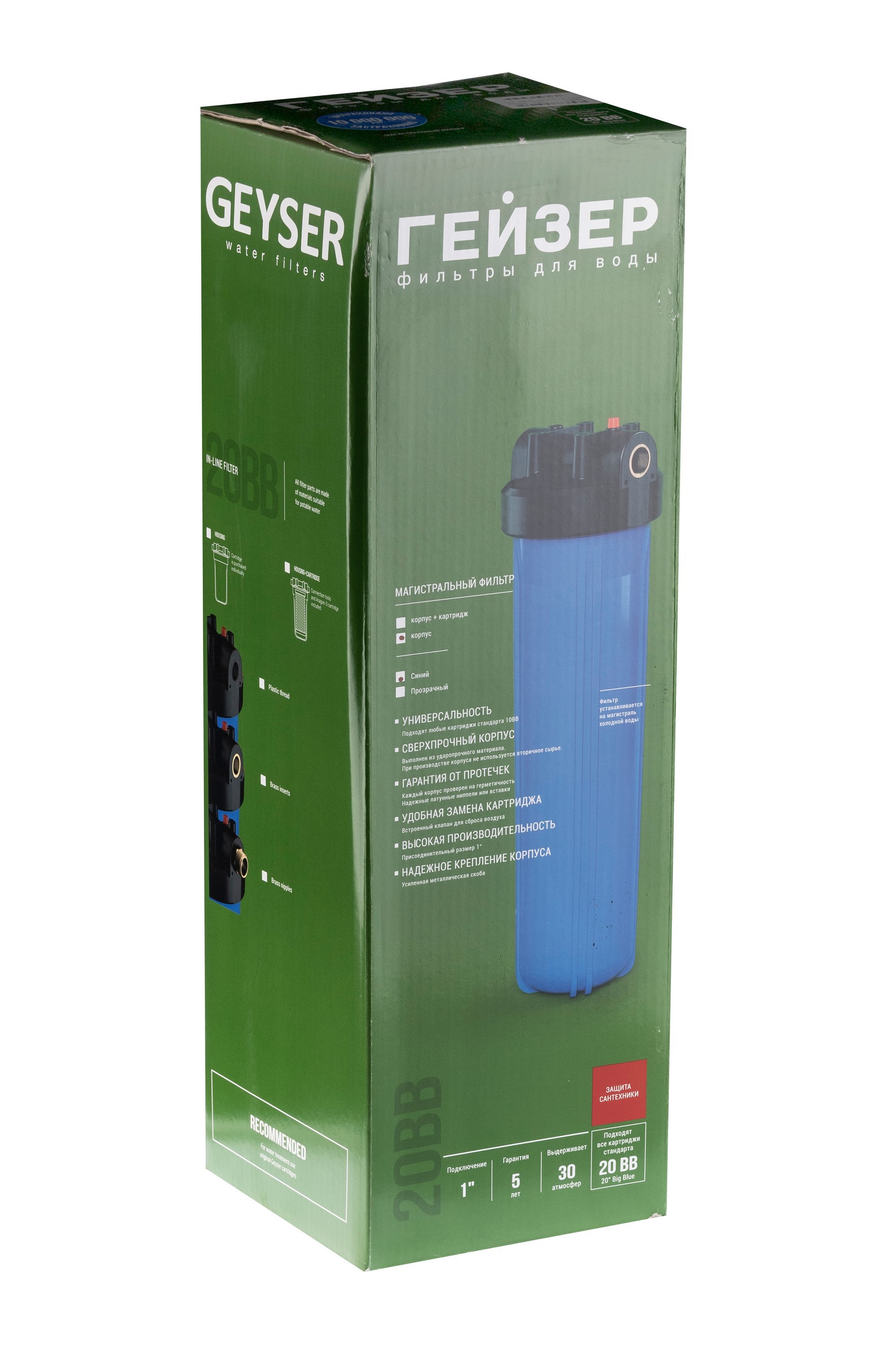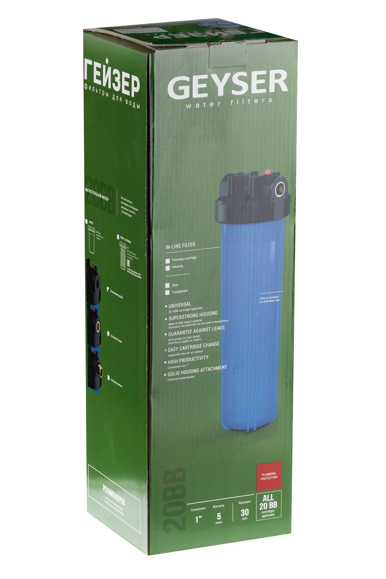 Корпус Гейзер 20BB изготовлен из синего полипропилена; крышка корпуса – черный полипропилен без ниппелей. Корпус рассчитан на работу под давлением и установку на входе в систему холодного водоснабжения. В производстве корпусов используется только первичное сырье пищевого класса.
