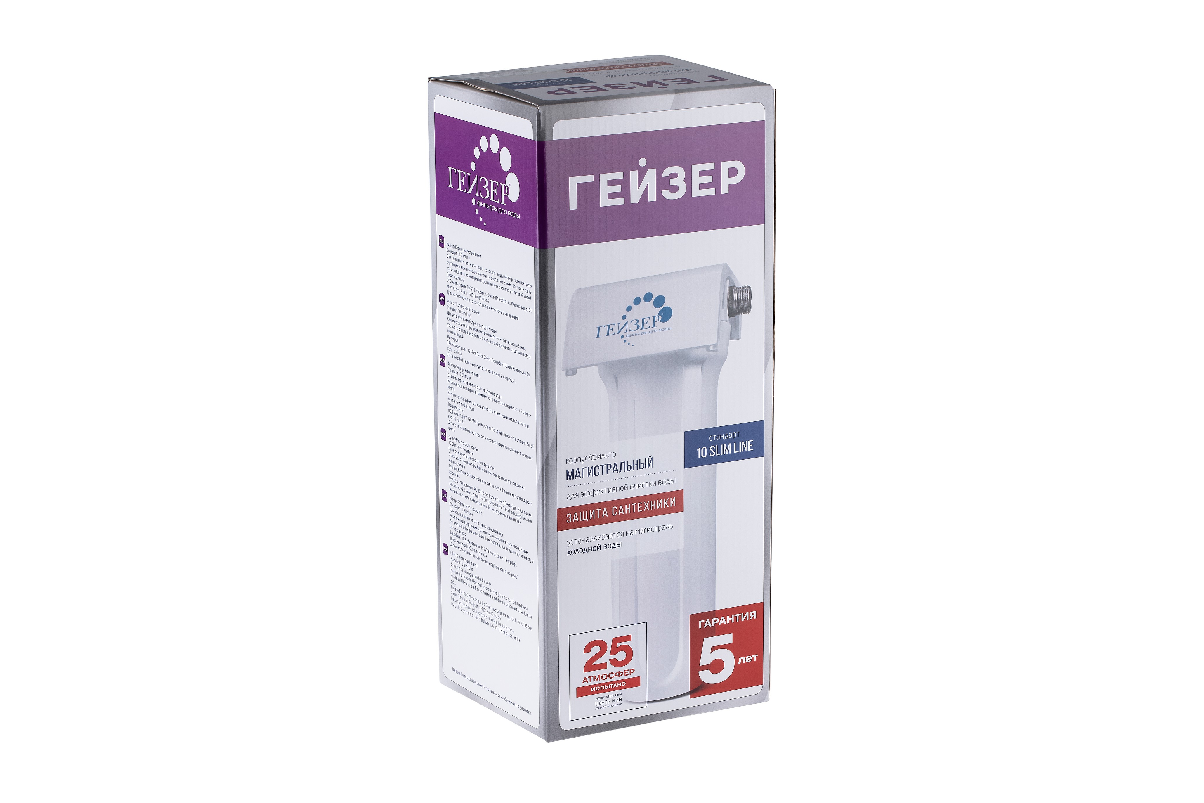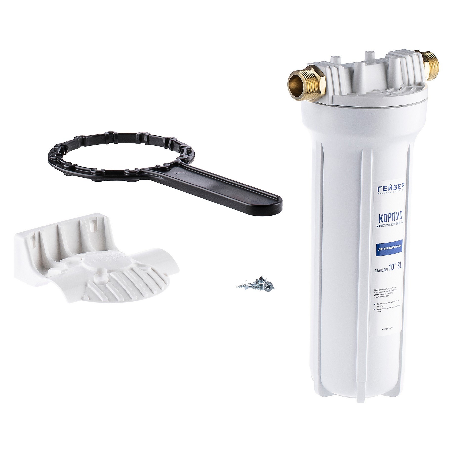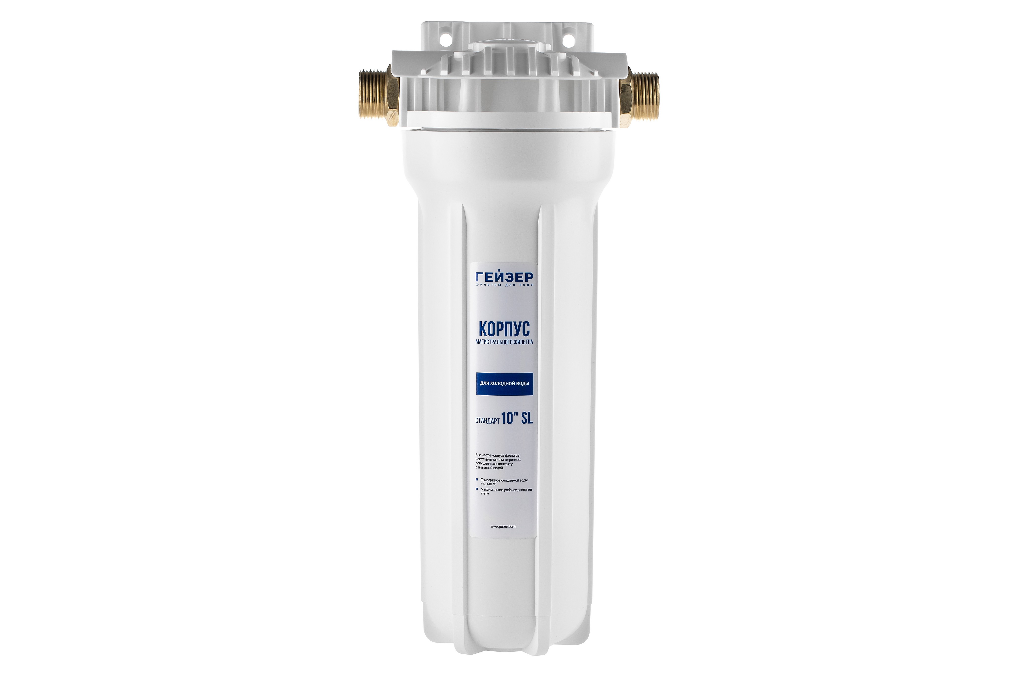 Корпус Гейзер 10SL 3/4" изготовлен из прочного белого полипропилена с металлическими ниппелями. Корпус рассчитан на работу под давлением и установку на входе в систему холодного водоснабжения. В производстве корпусов используются материалы пищевого класса.