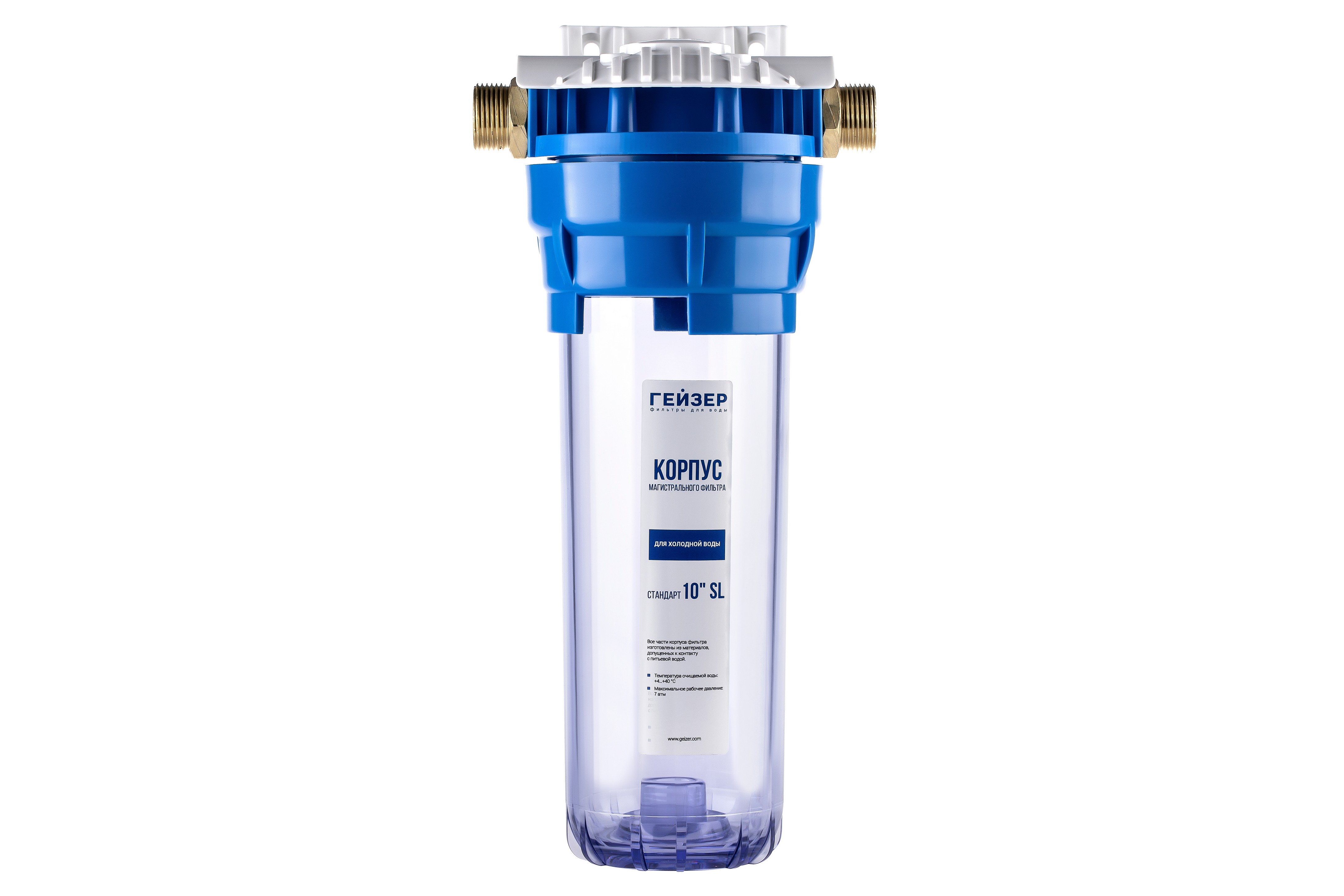 Корпус Гейзер 10SL 3/4 прозрачный изготовлен из прочного прозрачного полипропилена. Крышка корпуса – из синего полипропилена с металлическими ниппелями. Накидная гайка на корпусе значительно облегчает установку и замену картриджа. Корпус рассчитан на работу под давлением и установку на входе в систему холодного водоснабжения. В производстве корпусов используются материалы пищевого класса.