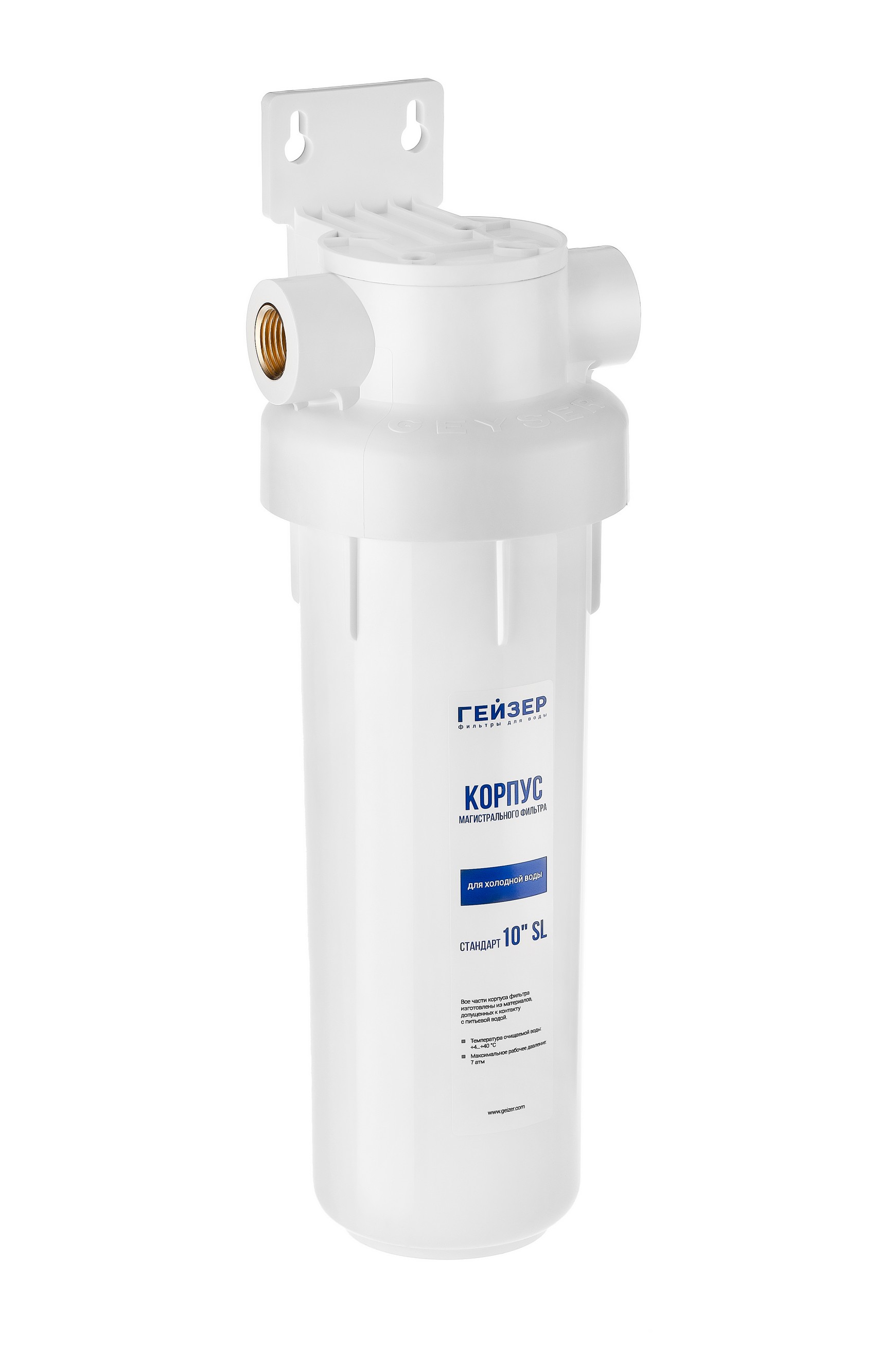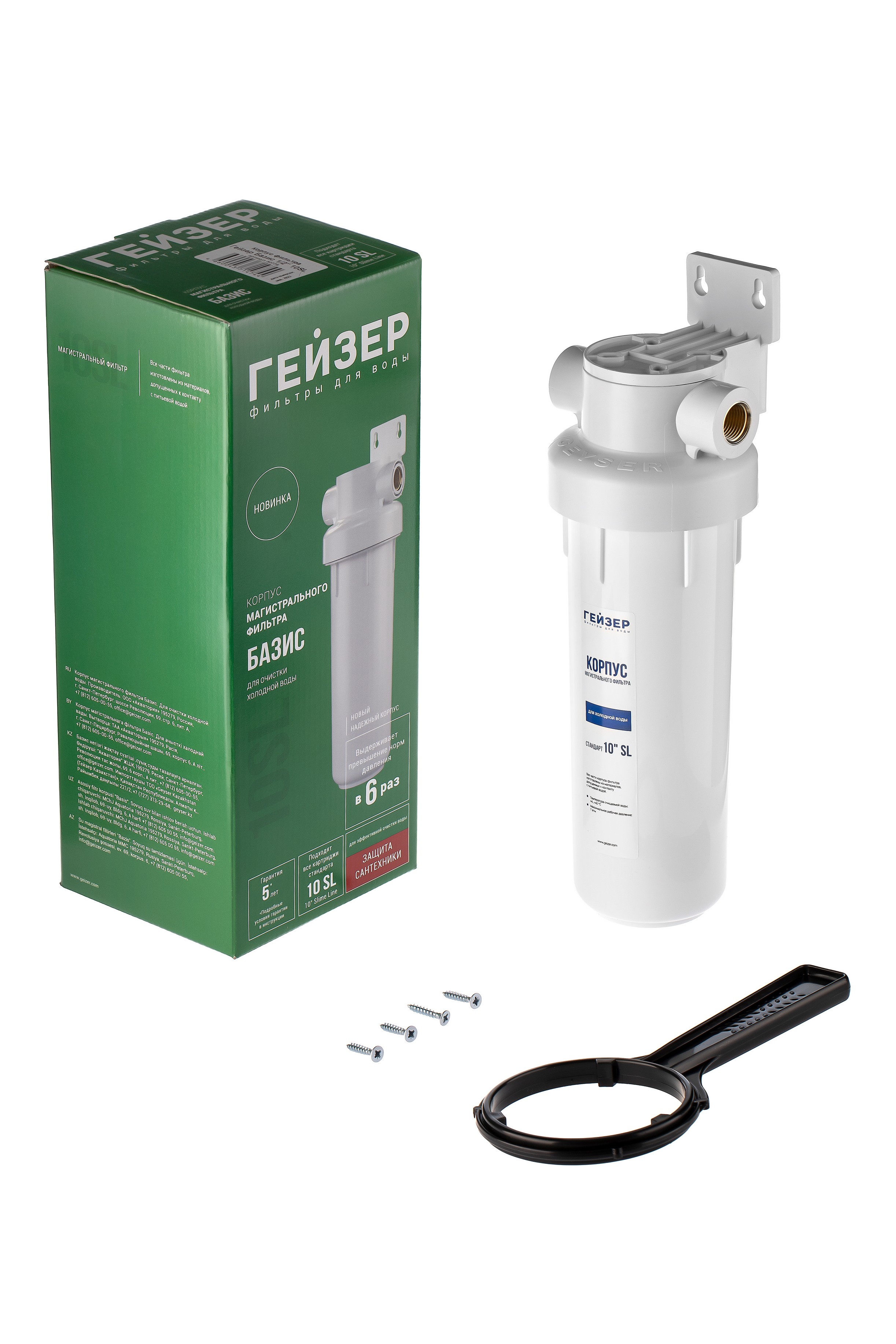 Корпус фильтра Гейзер Базис 1/2 10SL рассчитан на работу под давлением и установку на входе в систему холодного водоснабжения. В зависимости от установленного картриджа может выполнять очистку от механических примесей (ржавчина, окалина, песок и т.д.), хлора и органических соединений, солей жесткости, железа и марганца.