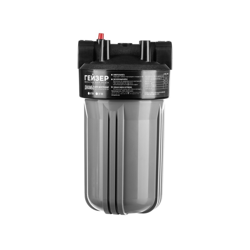 Корпус Гейзер Джамбо 10BB выполнен из сверхпрочного пластика, рассчитан на работу под давлением и установку на входе в систему холодного водоснабжения. Фильтр может применяться как отдельно, так и в составе комплексных систем водоочистки и водоподготовки.