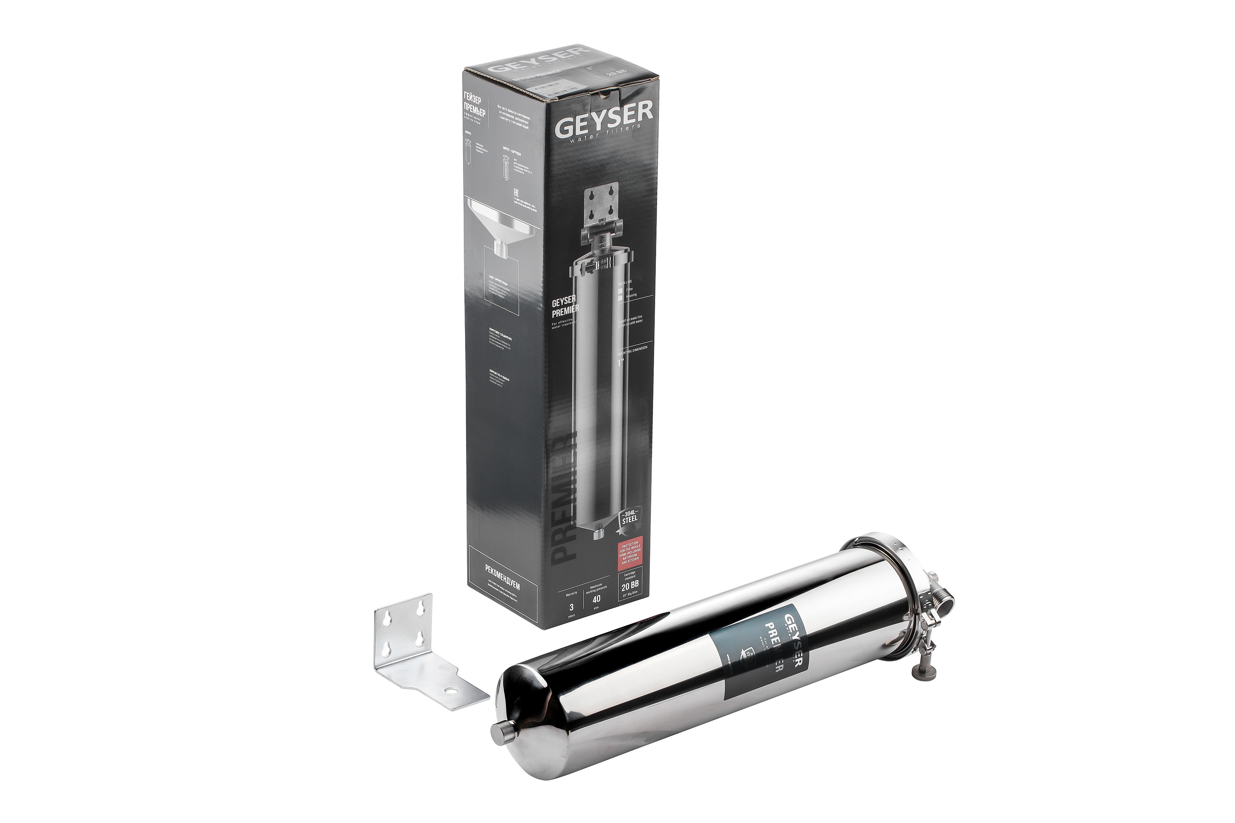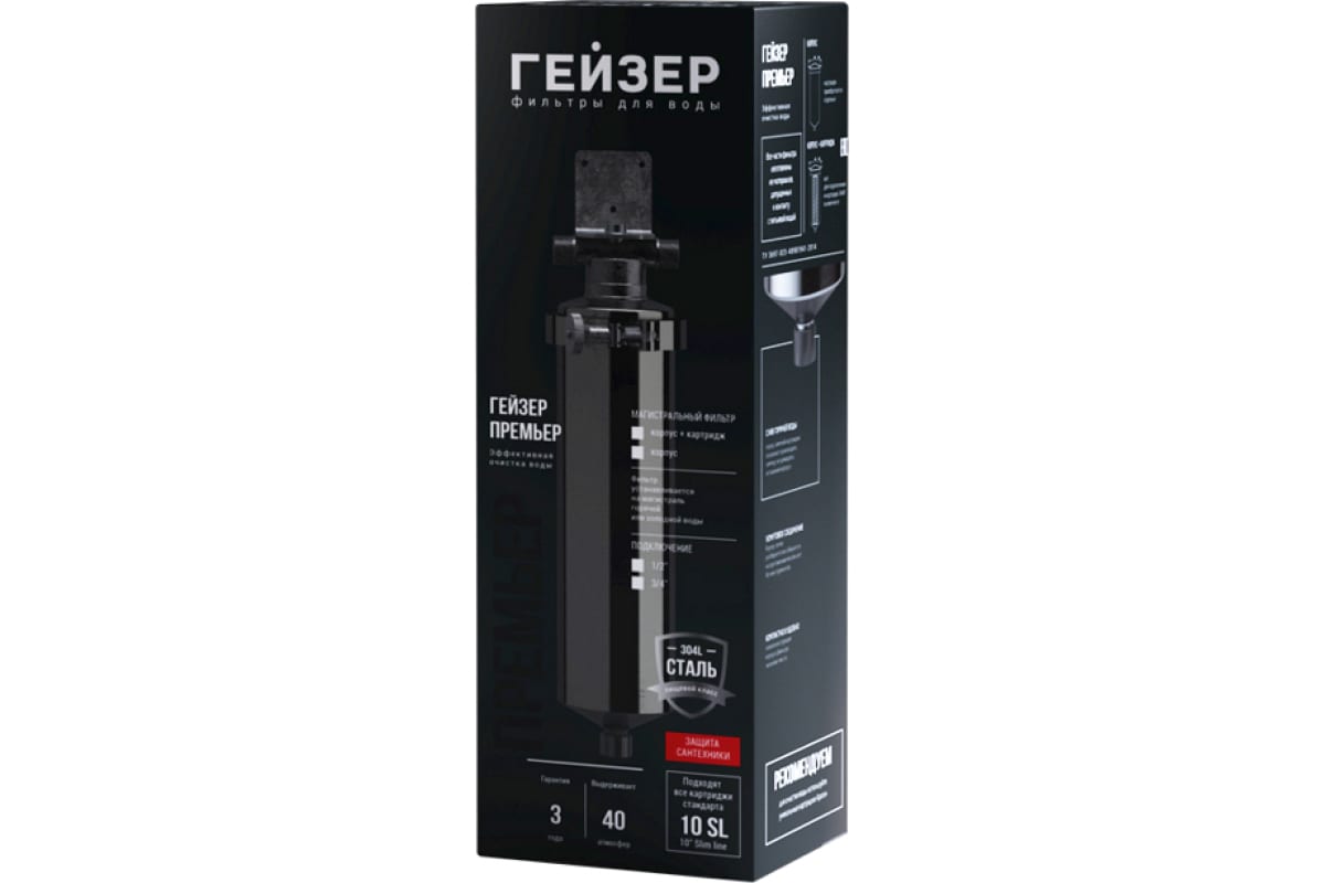 Гейзер-Премьер 20BB 1" легко подключается к магистрали и легко обслуживается. Хомутовое крепление крышки позволяет легко извлечь картридж без использования дополнительных ключей. Также для замены картриджа предусмотрено удобное отверстие для слива воды.