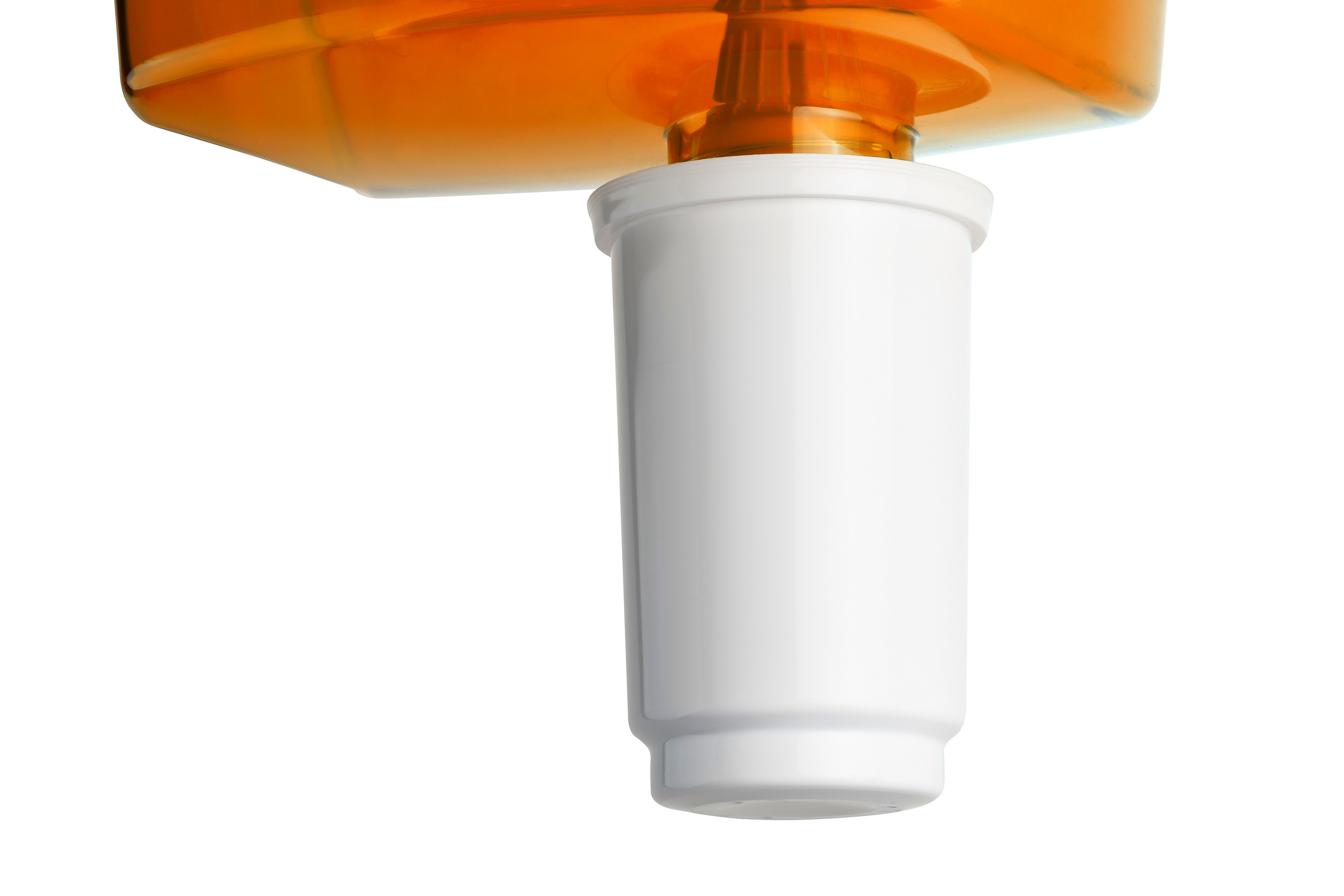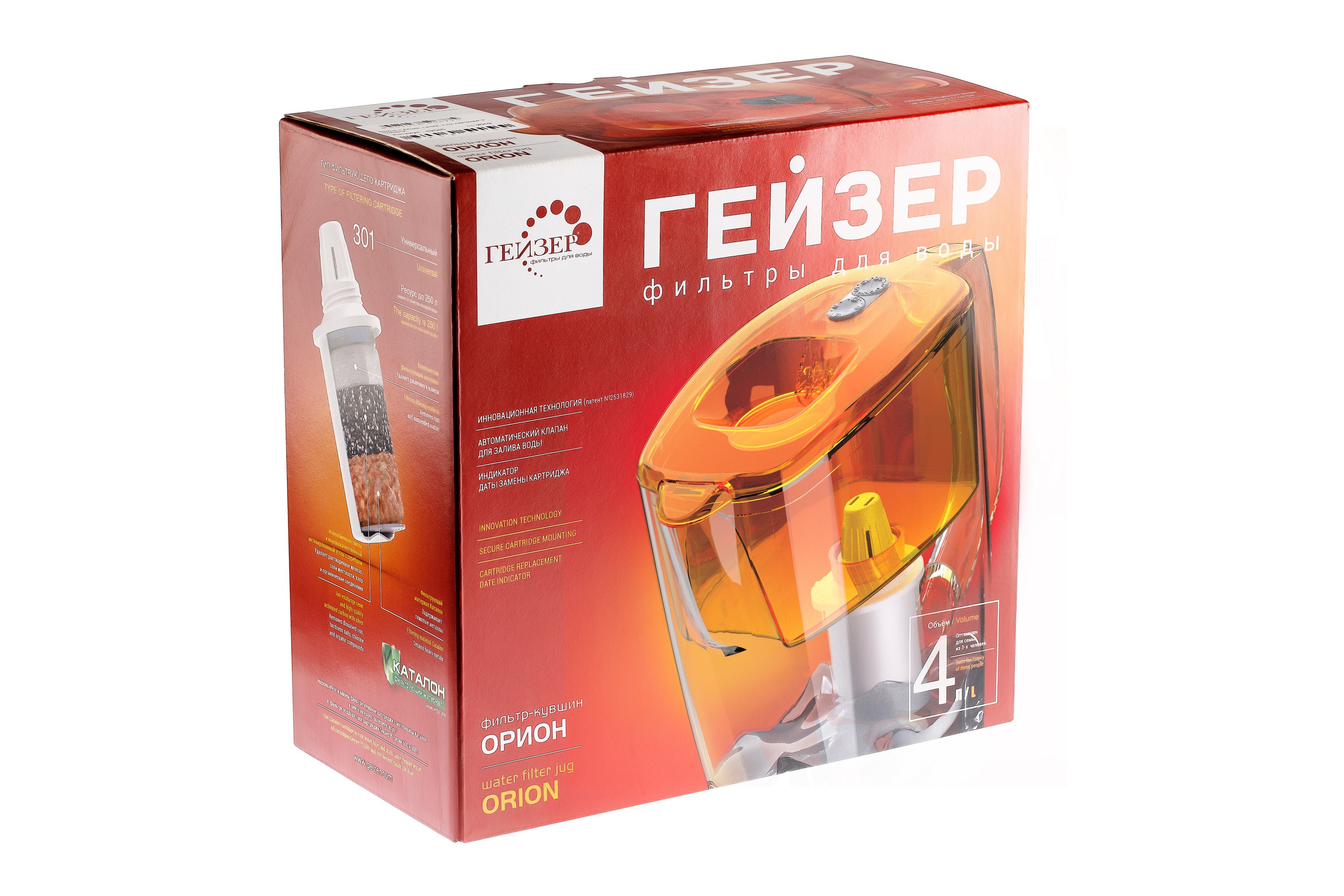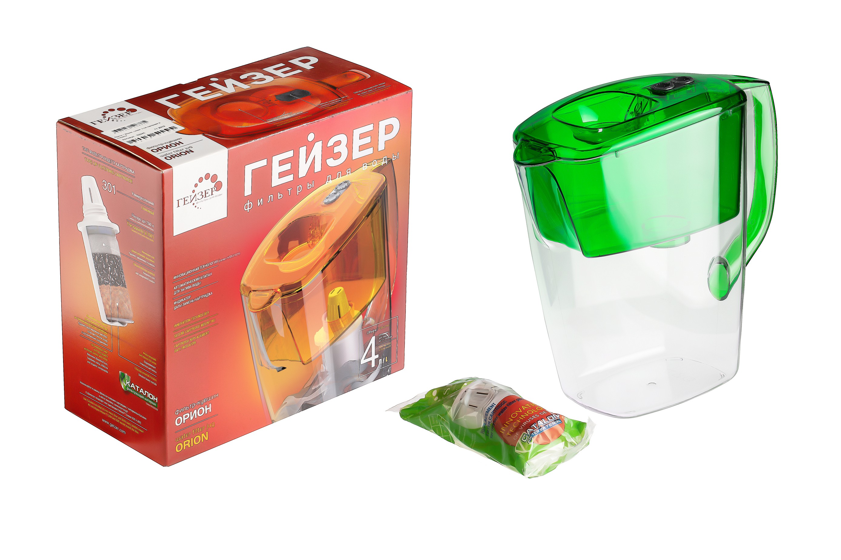 В комплект Гейзер Орион входит картридж 301 для фильтра-кувшина, состоящий из уникального материала Каталон, ионообменной смолы и кокосового угля. Картридж вкручивается в приемную воронку кувшина, обеспечивая герметичное соединение, что позволяет исключить протечку исходной воды.