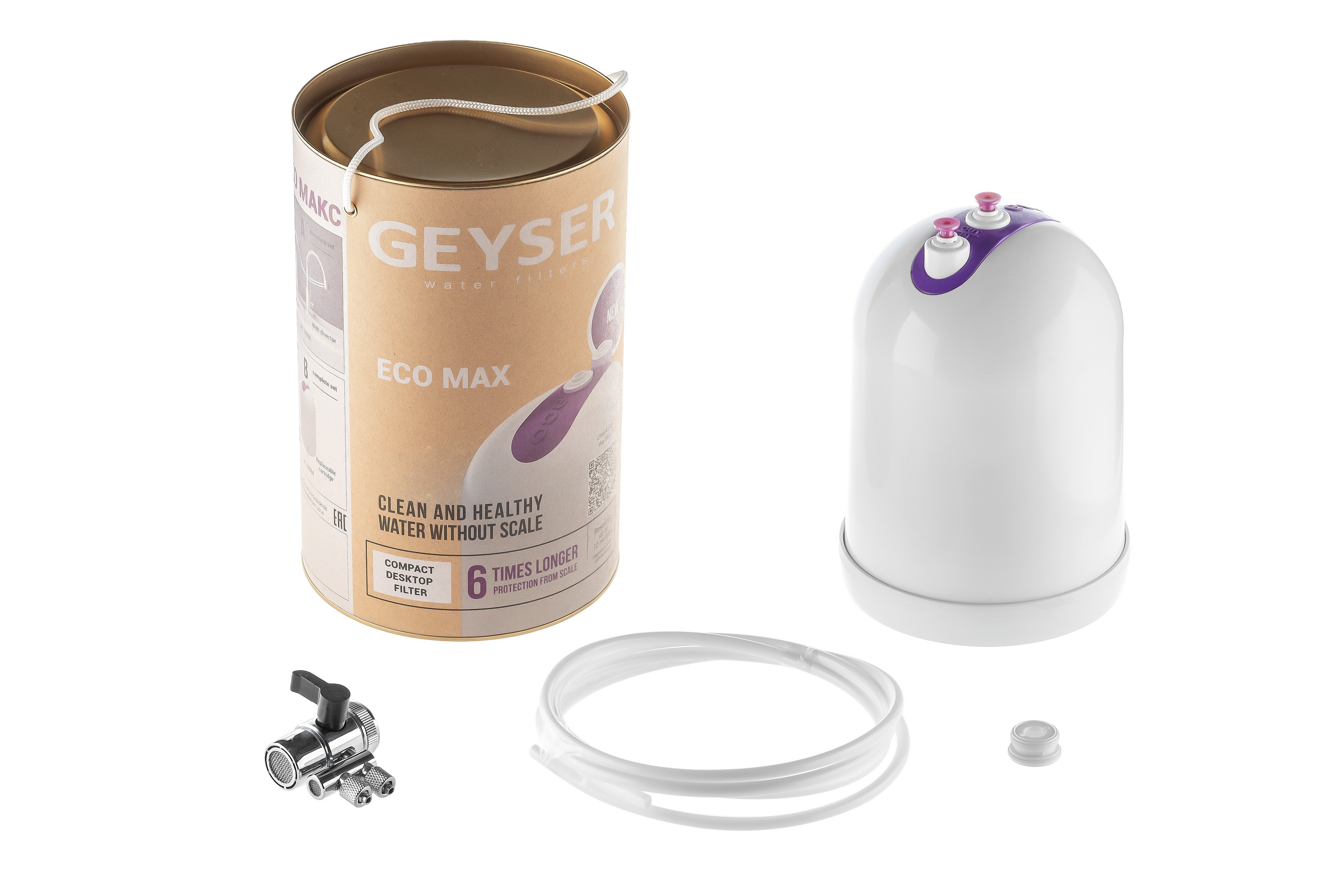 Фильтр Гейзер Эко Макс (настольное исполнение) предназначен для доочистки водопроводной воды от хлора, хлорорганических и органических соединений, тяжелых металлов, железа, нефтепродуктов, механических частиц и радионуклидов, бактерий, цветности и мутности, а также снижает содержание солей жесткости.