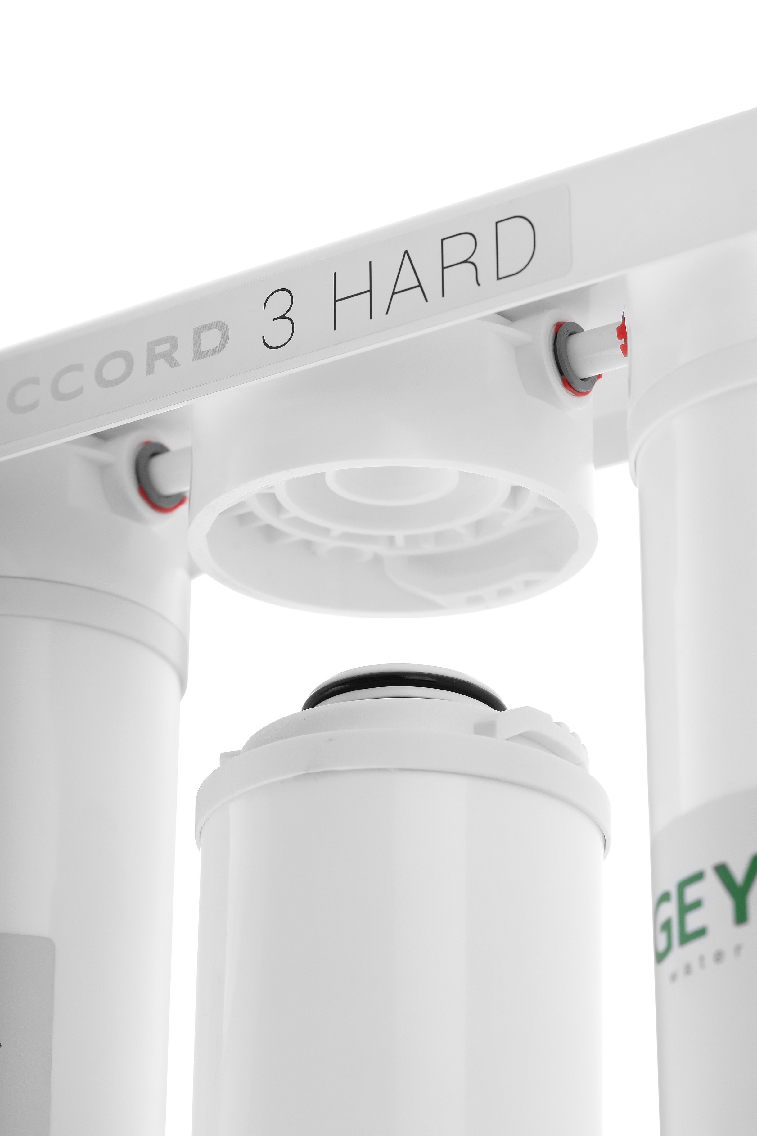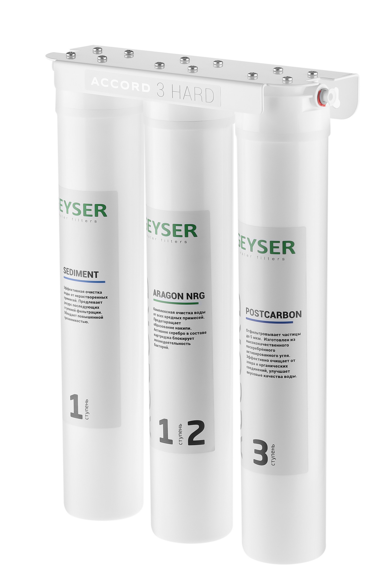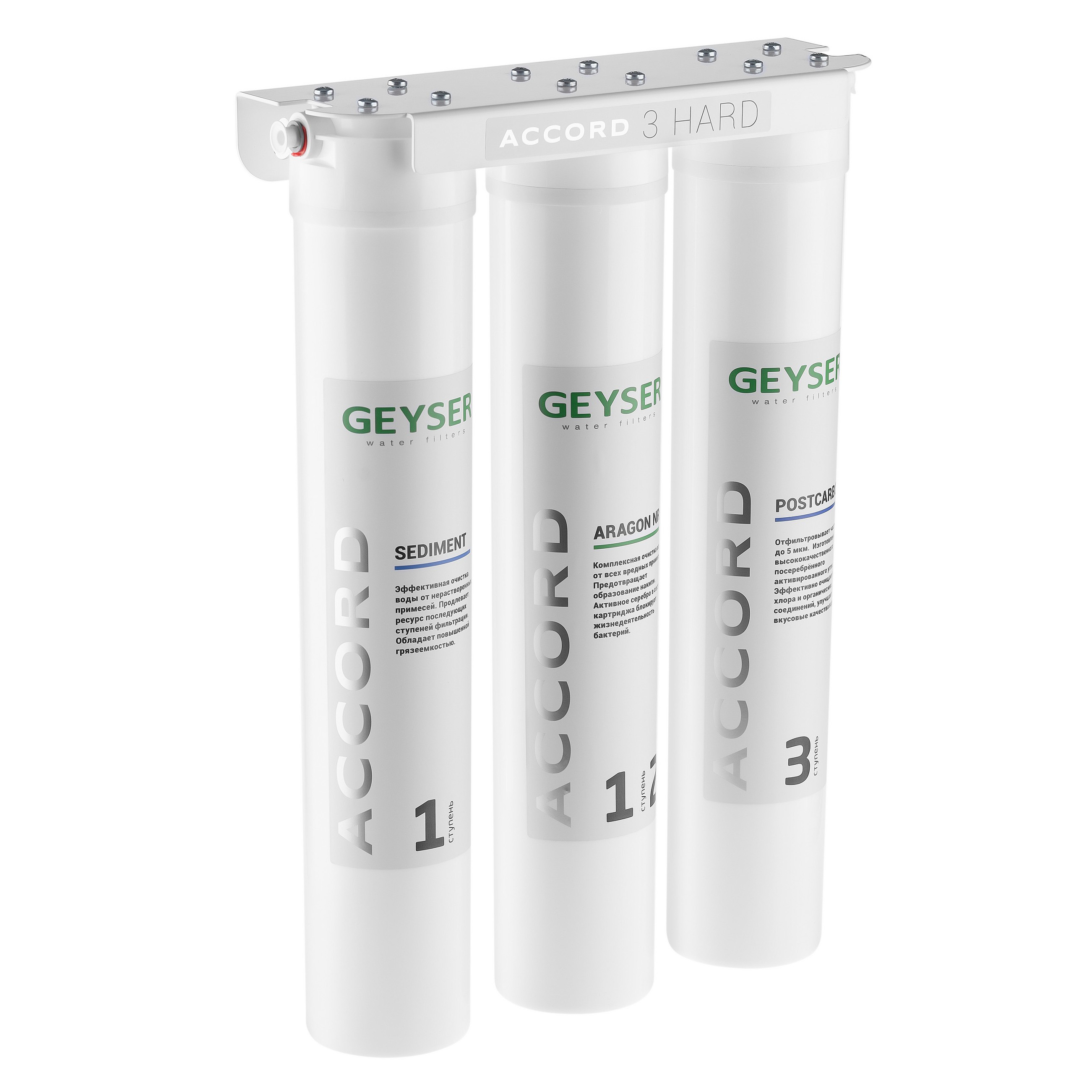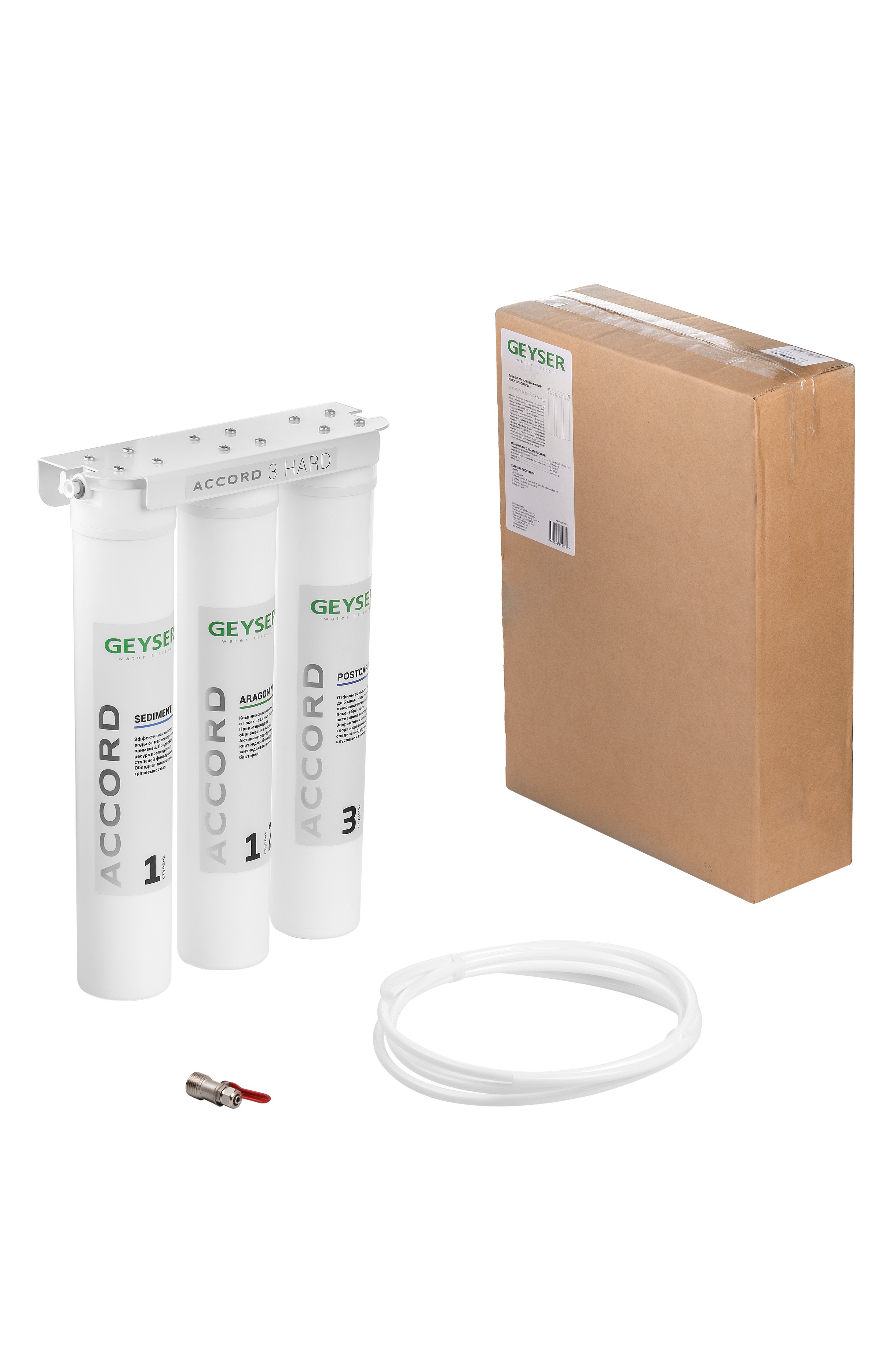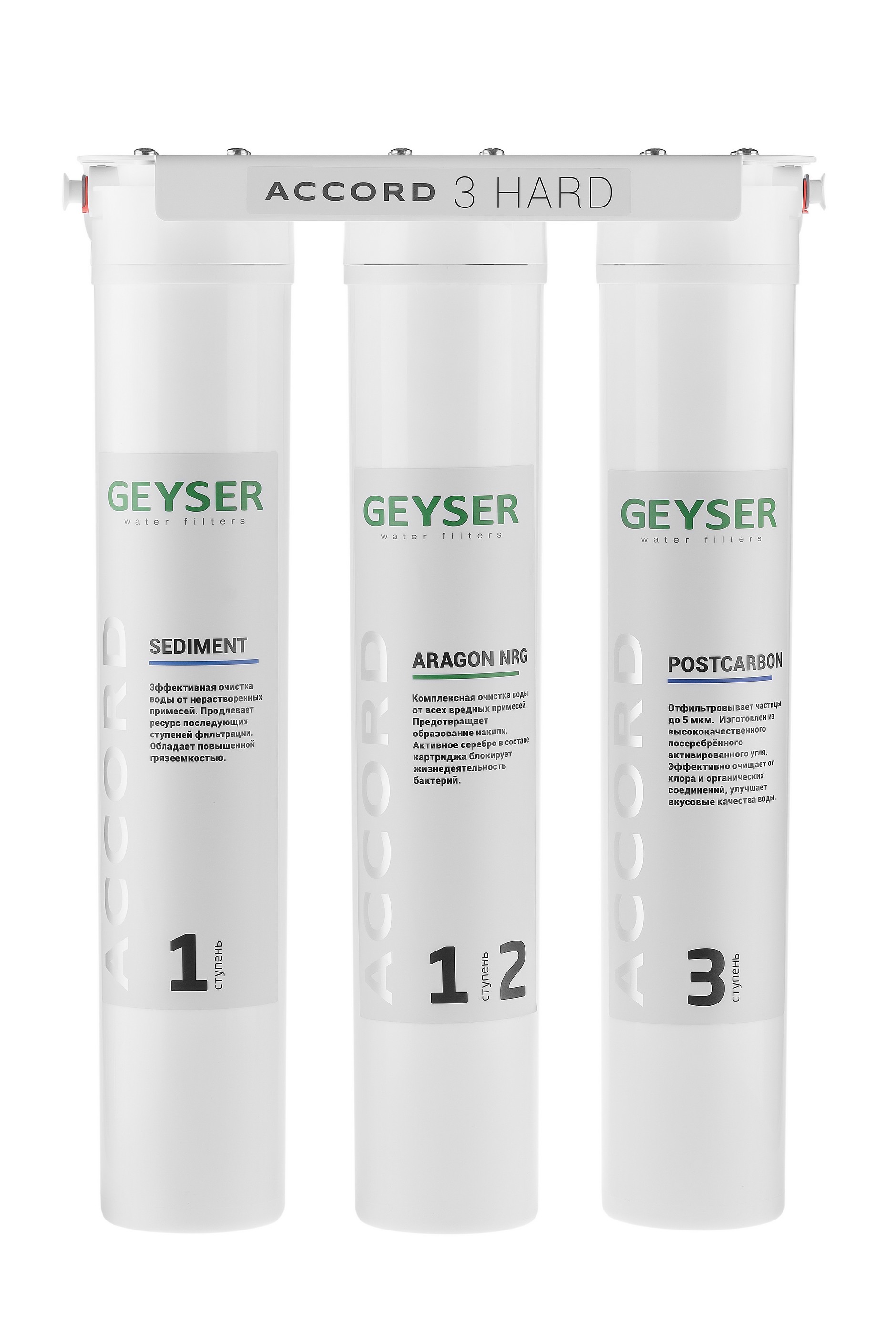 Geyser Accord 3 Hard – компактный трехступенчатый фильтр, специально разработанный для улучшения характеристик холодной воды из систем центрального водоснабжения, используемой в торговом оборудовании, профессиональном оборудовании для приготовления кофе и производства льда. Фильтр обеспечивает корректировку минерального состава исходной воды, сдерживает коррозийный процесс и образование накипи на нагревательных элементах оборудования. Фильтр доводит воду до норм, позволяющих оптимизировать качество приготовляемых напитков и льда.
