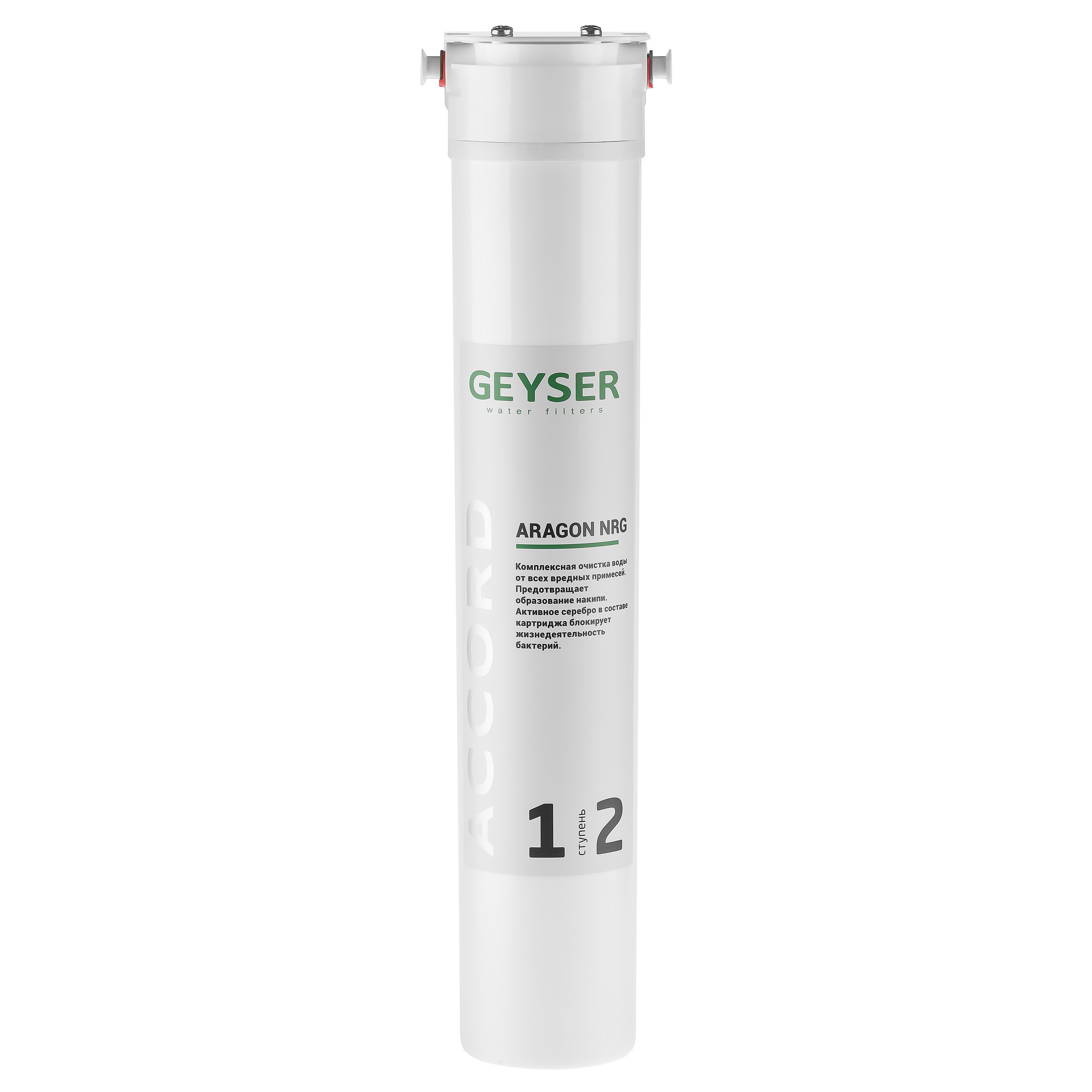 Aragon NRG Accord – комбинированный картридж для жесткой воды. Позволяеткомплексно очистить воду от всех вредных примесей, при этом предотвращает образование накипи. Активное серебро, внедрённое в состав картриджа, блокирует жизнедеятельность бактерий. В картридже Aragon NRG Accord реализован механизм стабилизации остаточной жесткости и эффект Квазиумягчения воды, при котором блокируется рост кристаллов карбоната кальция, а также ионов тяжелых металлов, таких как железо. Происходит пассивация нагревательных поверхностей с образованием защитного слоя, который препятствует коррозии (патент № 2775751).