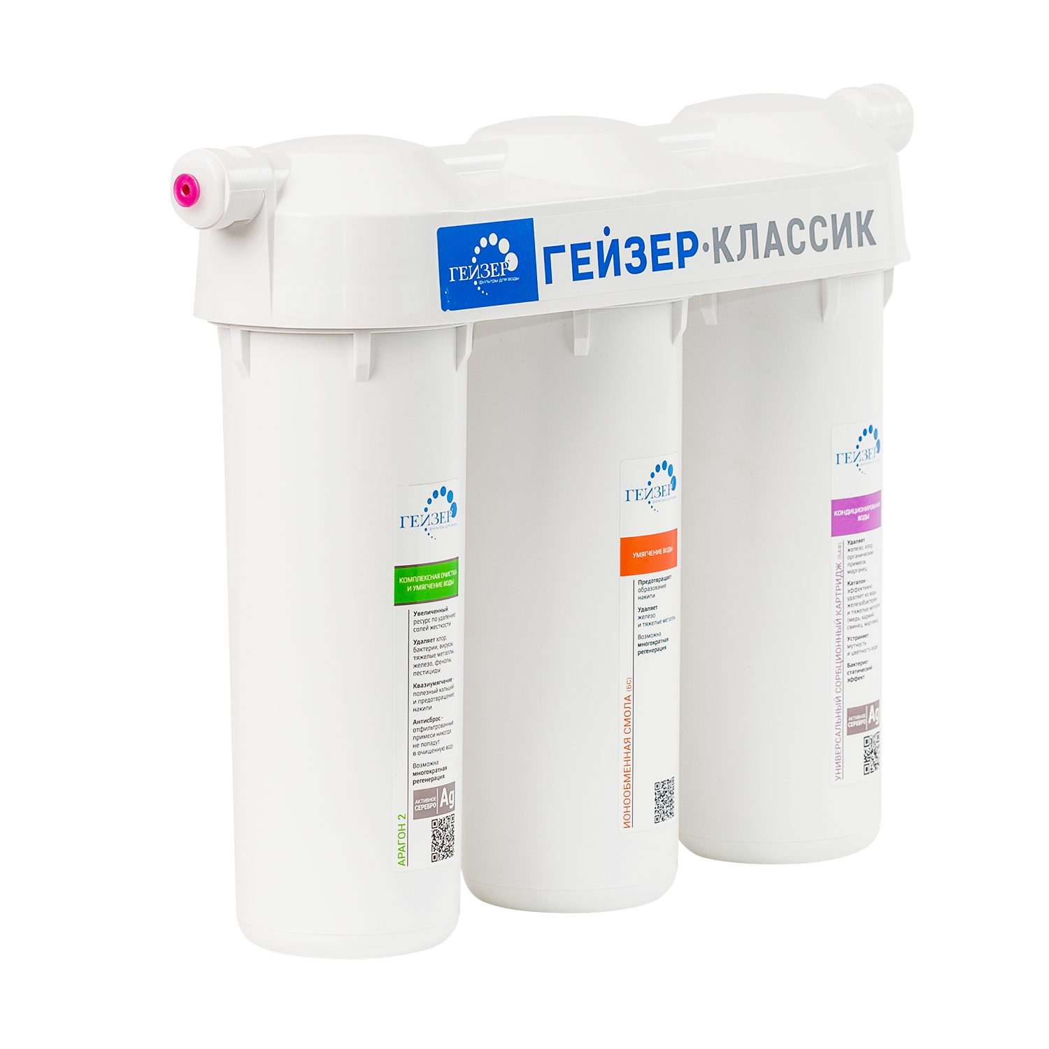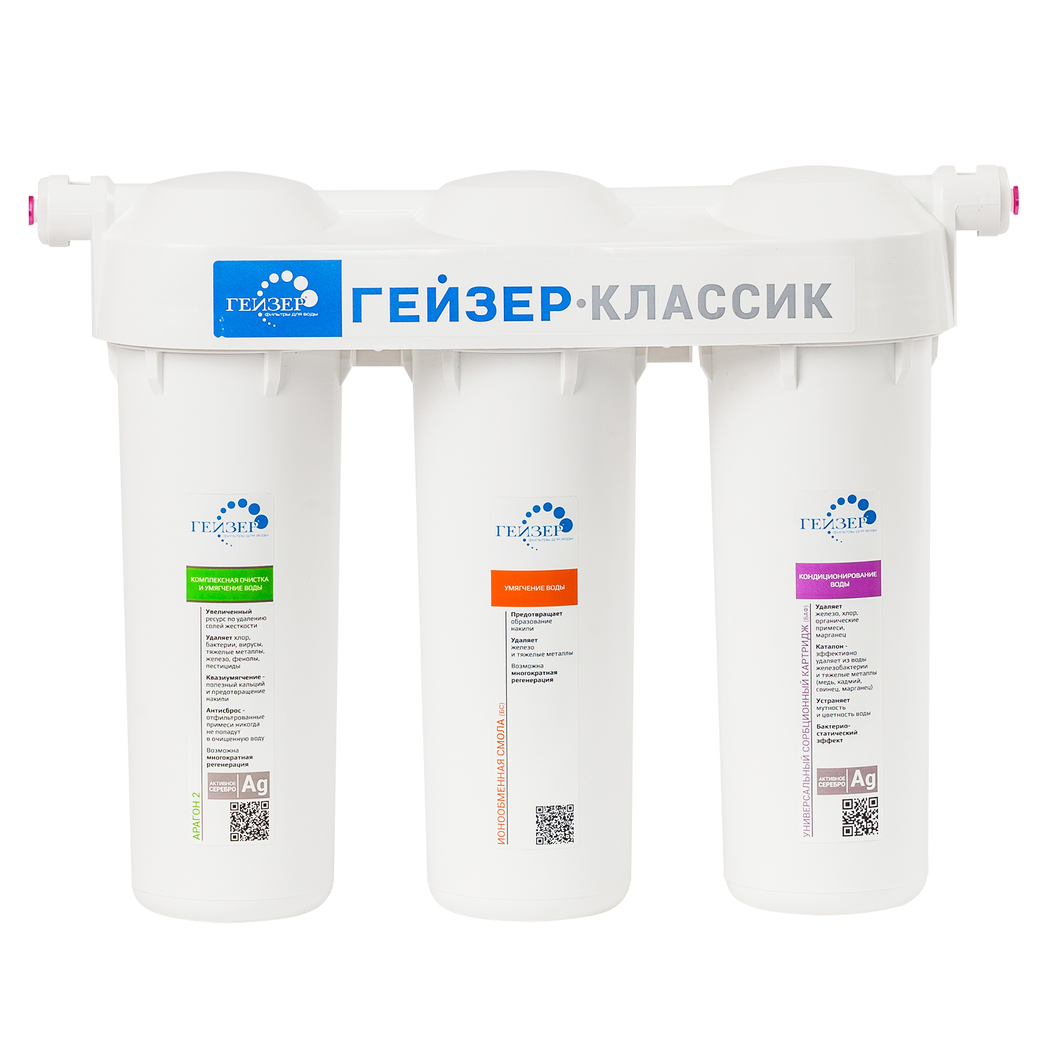 Фильтр для воды Гейзер Классик Комп 16020 состоит из трех ступеней: картридж Арагон 2, БС и БАФ. Фильтр удаляет из воды хлор и органические примеси, снижает содержание железа и тяжелых металлов. Температура очищаемой воды должна быть не более 40 градусов.