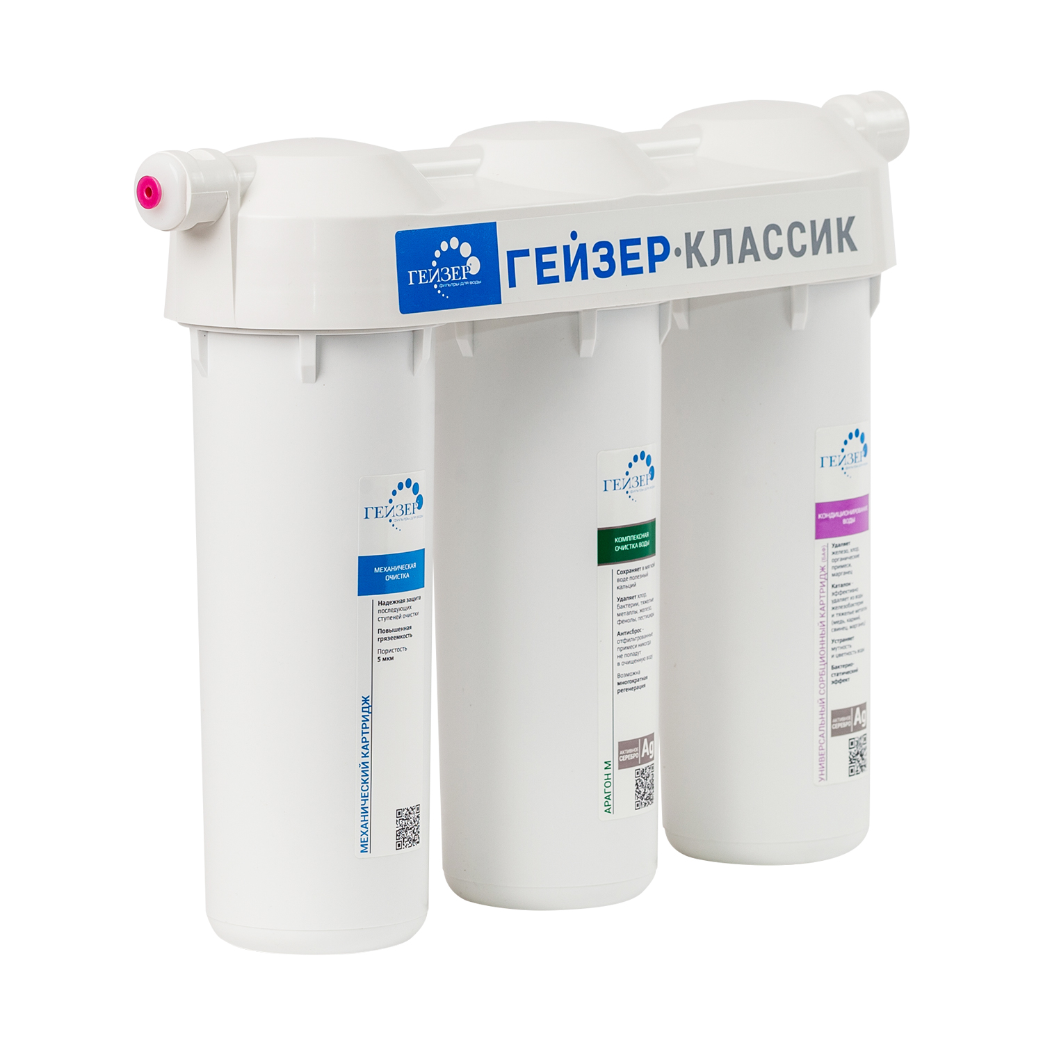 Фильтр для воды Гейзер Классик М 66028 предназначен для мягкой воды. Данный фильтр очищает воду от вредных примесей, хлора, органических примесей, снижает содержание железа и тяжелых металлов. Температура очищаемой воды должна быть не более 40 градусов. Фильтр имеет три ступени очистки.