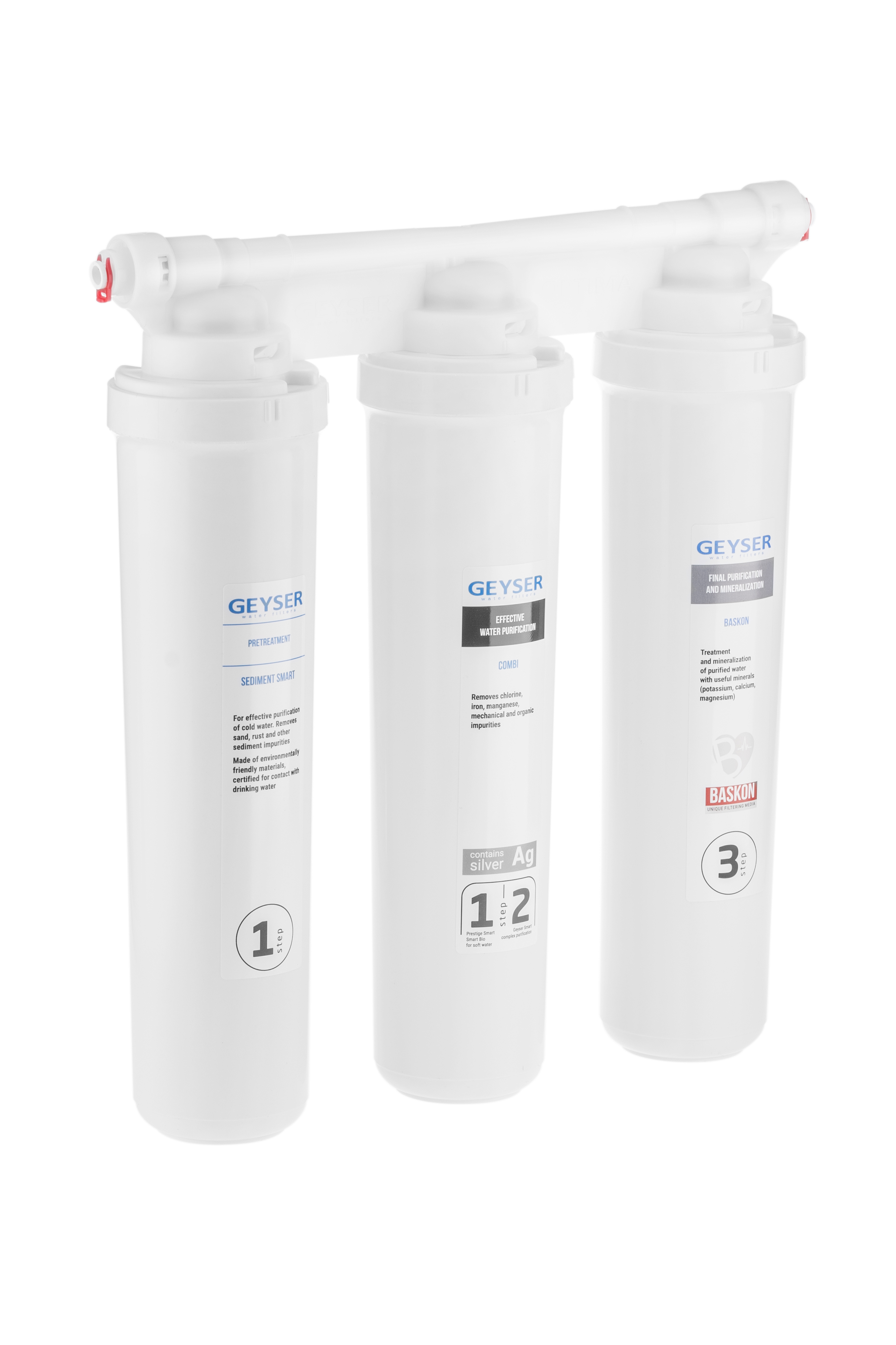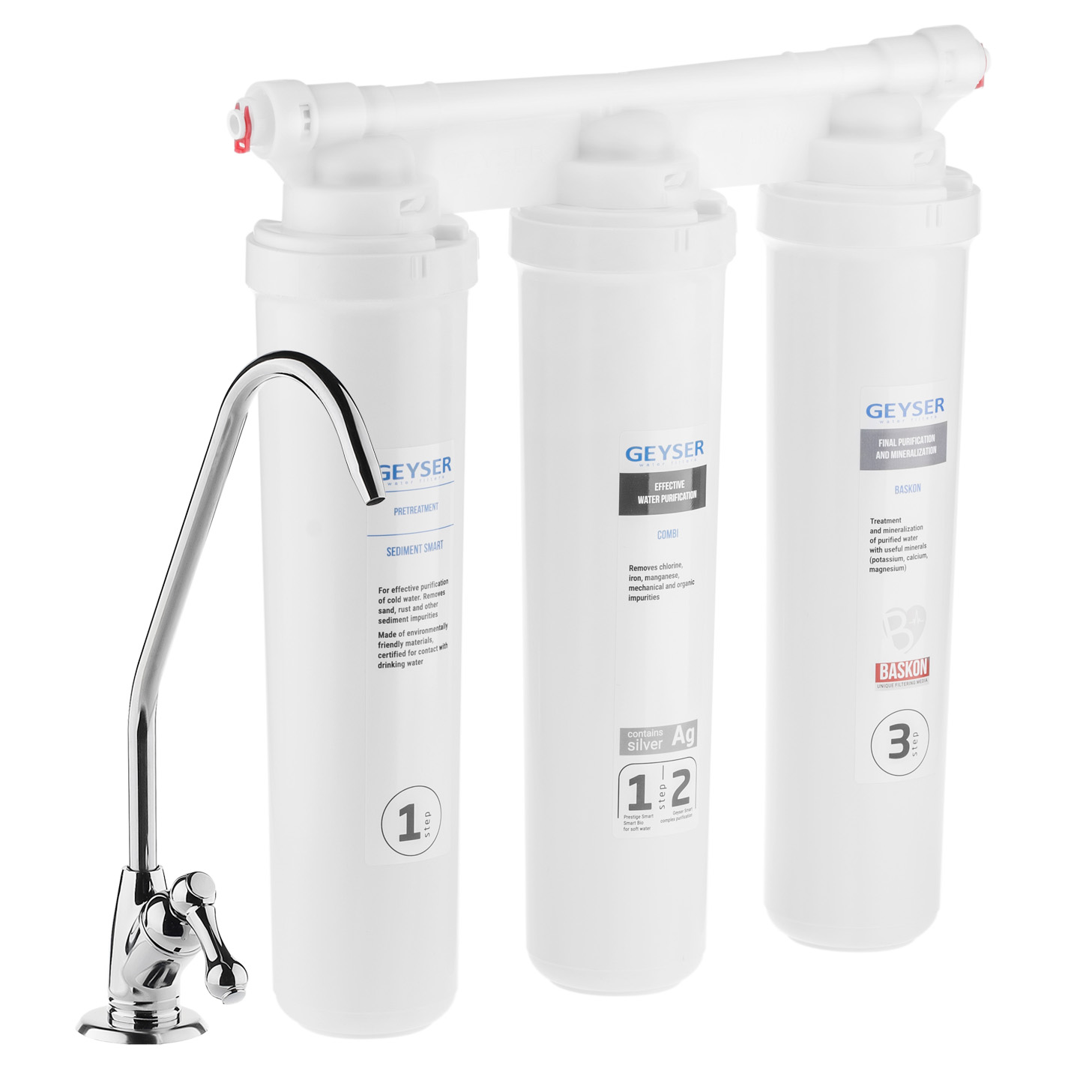 Фильтр выполнен из пищевого пластика, допущенного к контакту с питьевой водой. К фильтру подходят любые сменные картриджи из серии Гейзер Смарт/Оптима.