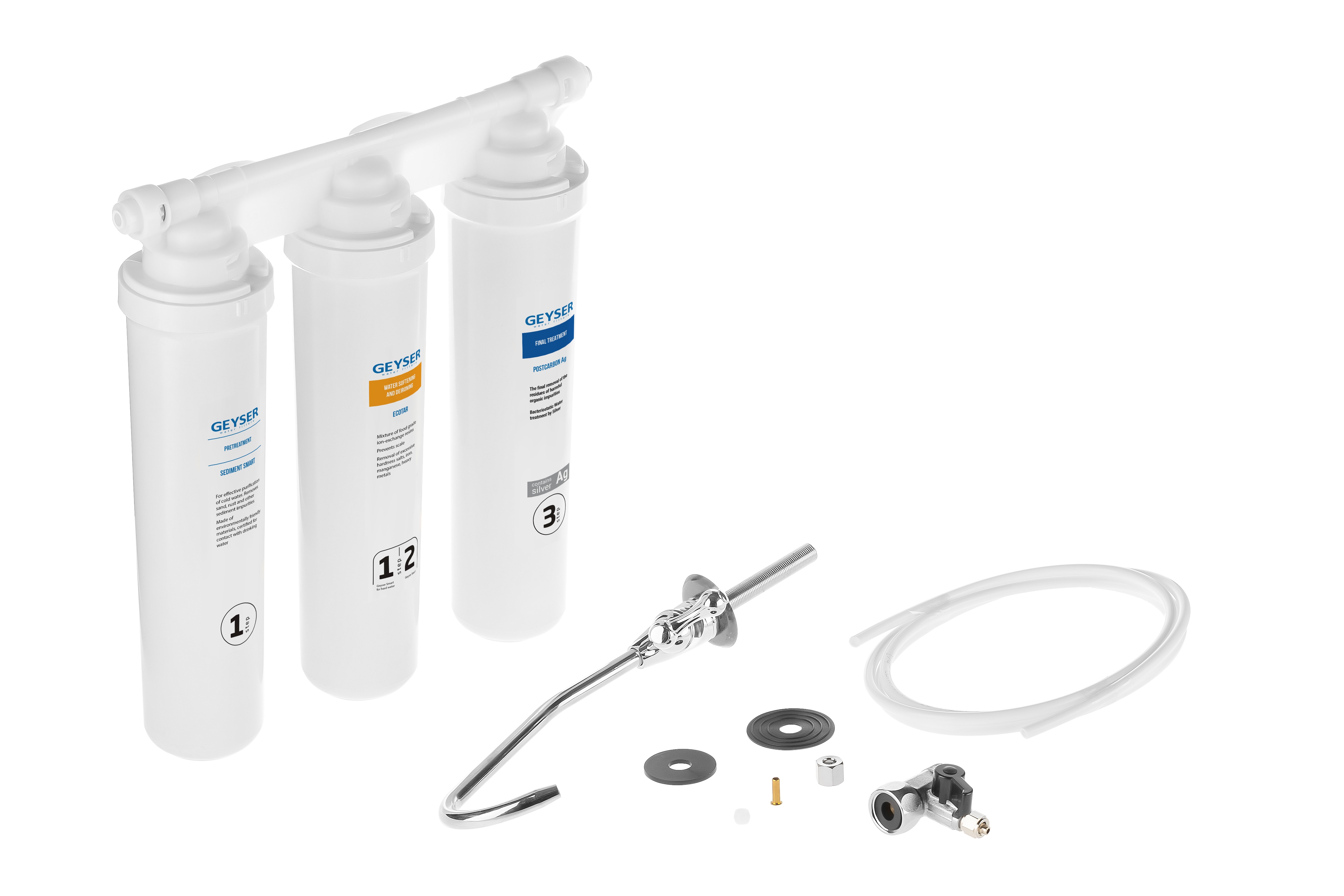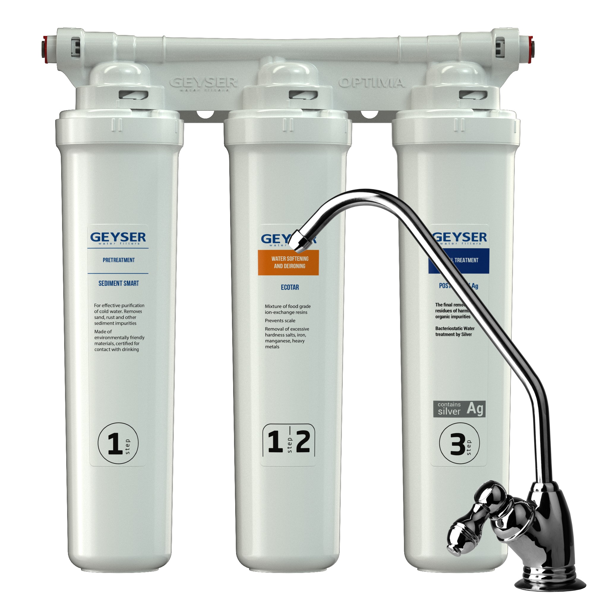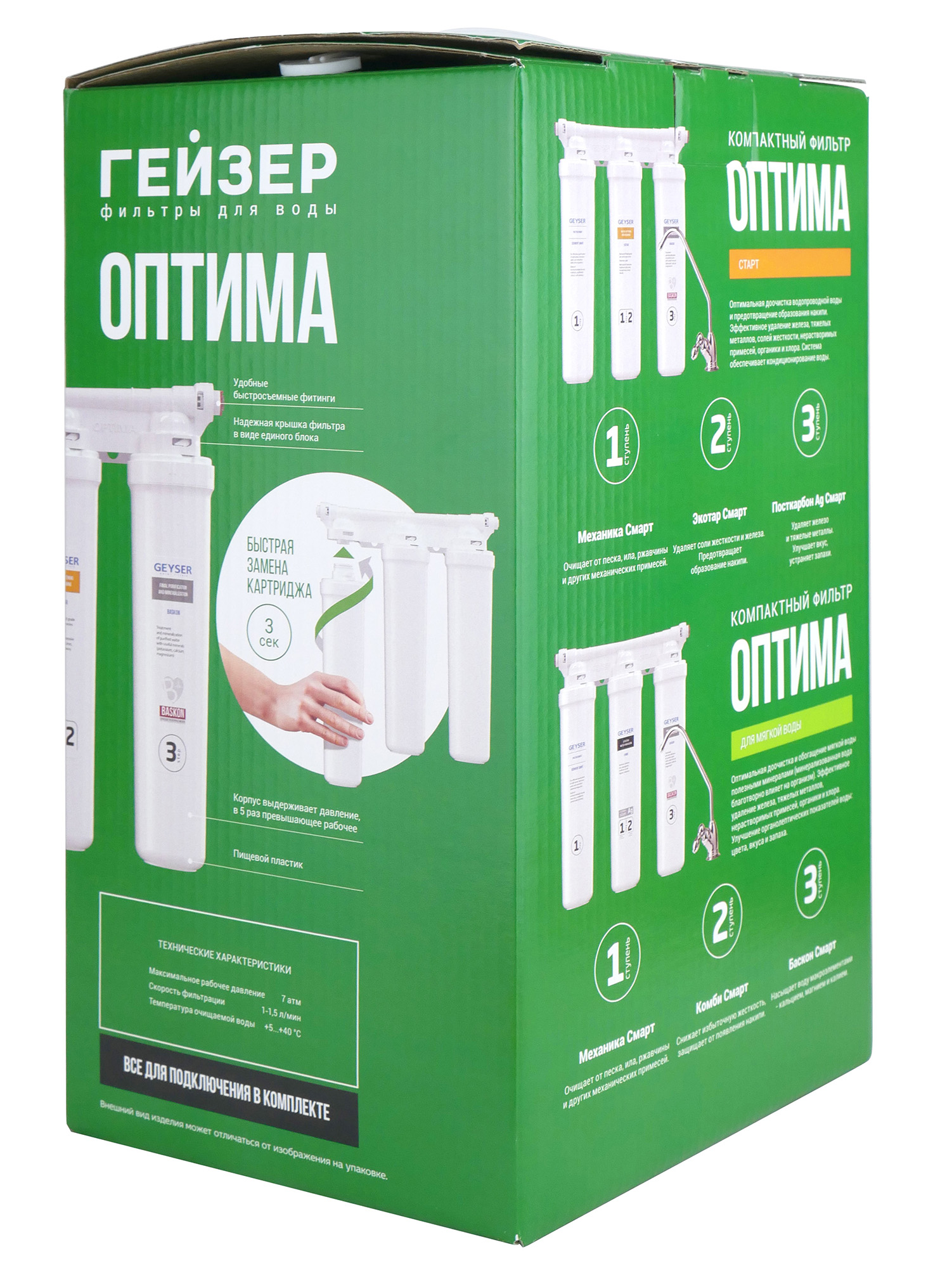 Вода в фильтре Гейзер Оптима Старт проходит три этапа очистки: