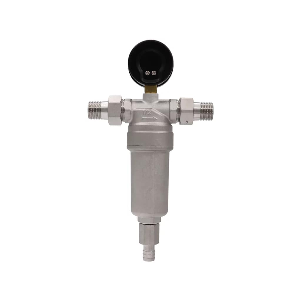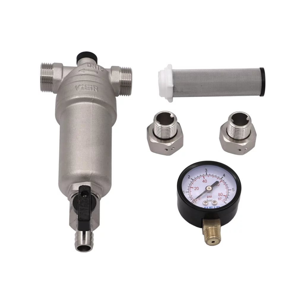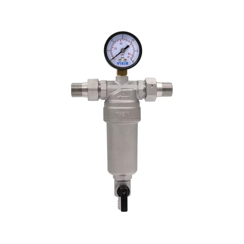 Фильтр с манометром самоочищающийся 1" со сгонами для гор. воды Vieir (никель) (JH155-N)