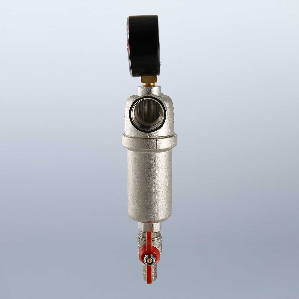 Корпус и колба фильтра выполнены из латуни марки CW617N (европейский стандарт EN 12165), никелированы. Предусмотрены дренажный шаровой кран со штуцером для подключения шланга и манометр для контроля уровня загрязненности сеток. Фильтр монтируется в вертикальном положении, колбой вниз. Резьба присоединений – внутренняя.