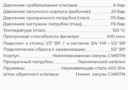 - Давление срабатывания клапана: 8 бар.