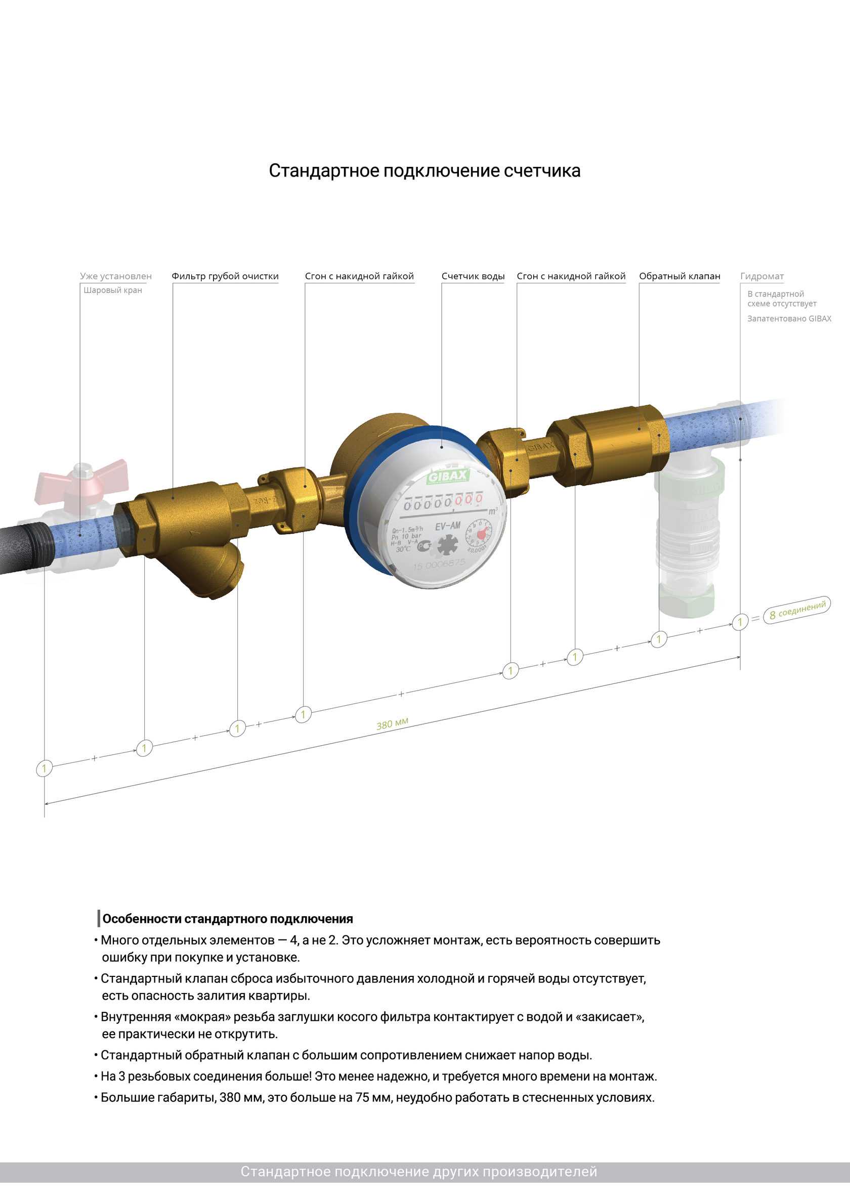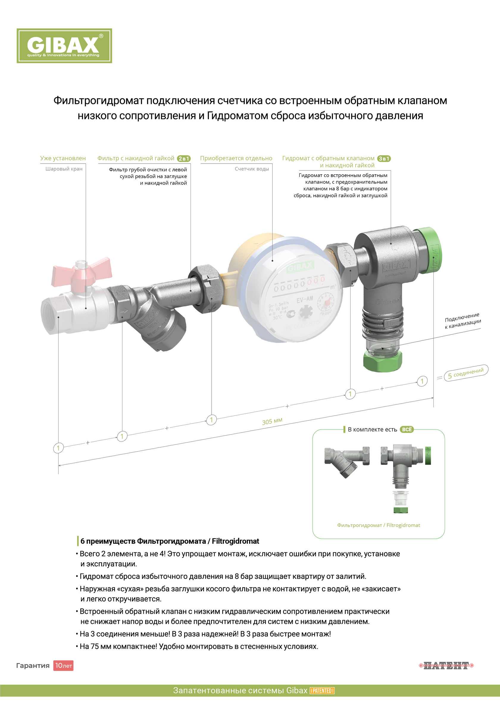 GIBAX Фильтрогидромат применяется в системах холодного и горячего водоснабжения для подключения счетчика воды. Фильтрует воду, поступающую в счетчик и систему водоснабжения, и обеспечивает защиту оборудования и элементов трубопровода от разрушительного воздействия высокого давления и гидроударов. Встроенный обратный клапан предотвращает передавливание холодной воды в горячую и наоборот, тем самым исключая некорректный учёт воды счетчиком.