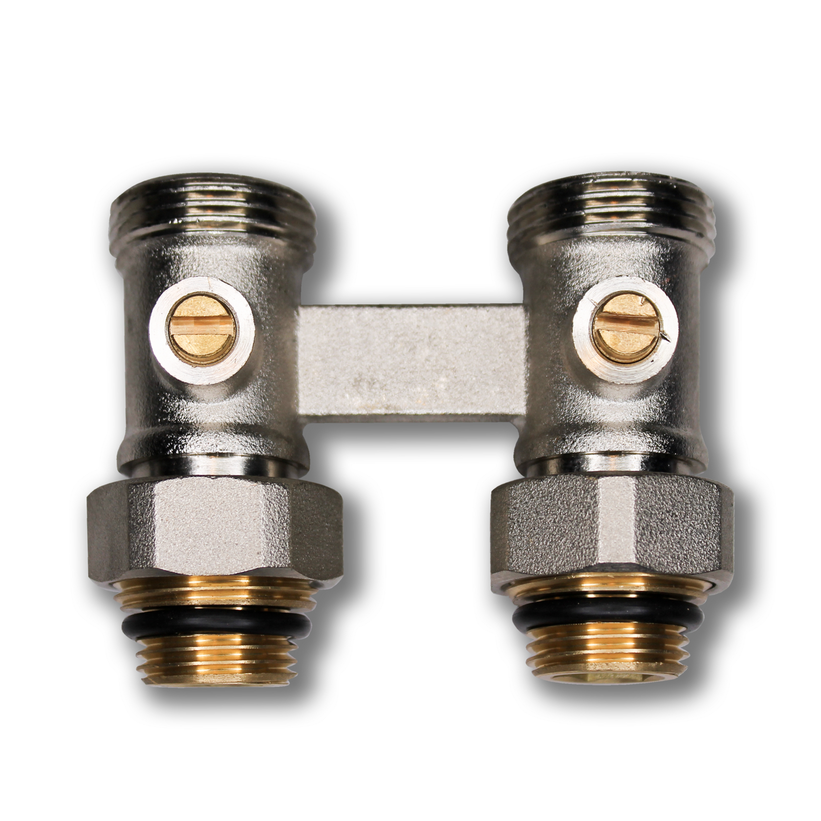 Прямой блок нижнего подключения к радиатору со встроенными шаровыми кранами состоит из двойного прямого компакт-вентиля 3/4""НР x 3/4""ВР, 2-х латунных переходников 1/2""НР х 3/4""НР и 2-х пластиковых адаптеров под евроконус 3/4"". Узел нижнего подключения к стальному панельному радиатору. Никелированная латунь CW614N.