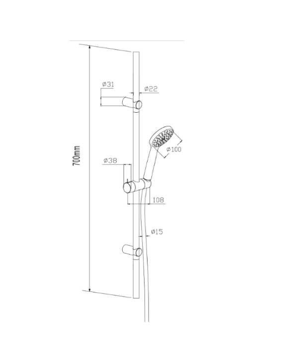 Ручной душ (1 функция) , душевая штанга 700 мм, гибкий шланг, держатель. Материал: латунь. Размеры: 780х635х350 мм.