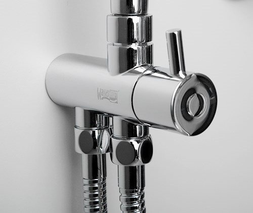Керамический поворотный переключатель cостоит из двух керамических дисков, плотно прижатых друг к другу. Керамические диски имеют отверстия, которые в зависимости от поворота переключателя смещаются и открывают доступ воде в душевой шланг или душевую насадку, запирая при этом противоположный выход. Для переключения необходимо повернуть ручку переключателя в любую сторону на 90 градусов.