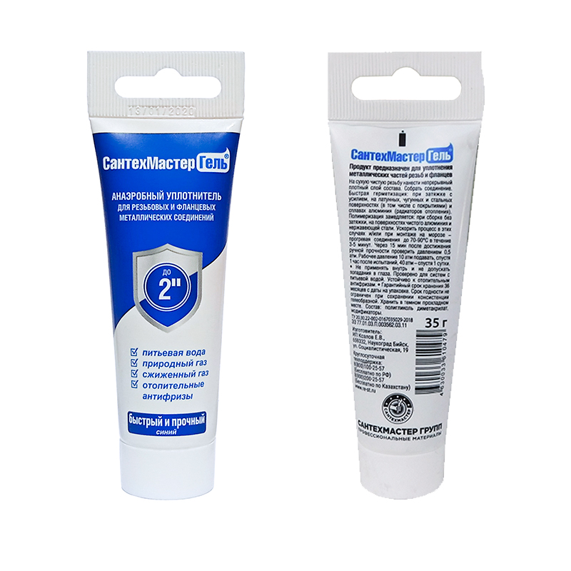 ""СантехМастер Гель Синий 35 гр - это резьбовой герметик для сантехники со средней степенью фиксации соединения. Данный состав рекомендован к использованию для герметизации металлических резьба, фитингов и фланцев. Используется для соединений диаметром до 2"". Соединение, собранное на данный гель поддается демонтажу с использованием инструмента.