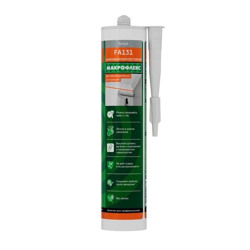 Герметик Makroflex FA131 произведен на однокомпонентной акрило-латексной основе. Средство белого цвета, его шов будет практически незаметен на многих поверхностях и материалах.