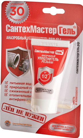 Сантехмастер Гель Красный для чугуна и стали 15 г — это анаэробный герметик для резьбовых соединений из черного металла. Этот гель отлично подходит для сверхпрочной фиксации и герметизации резьбы и фитингов в трубопроводах, собранных с использованием черных металлов. Применяется для соединений диаметром от 1,5"".